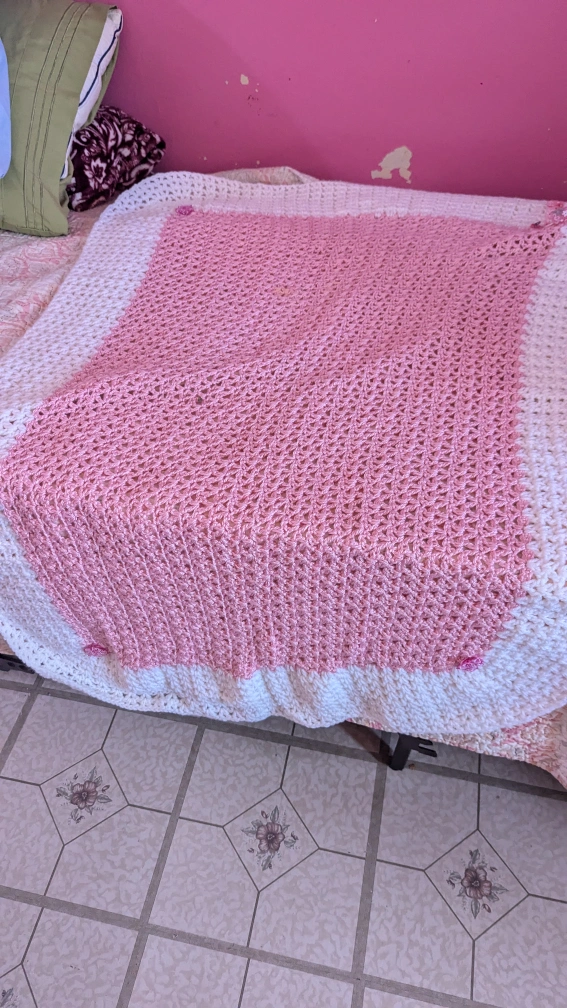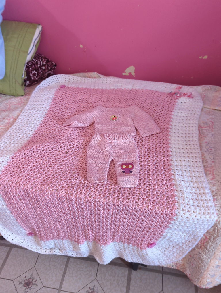 113Selling a handmade crocheted baby blanket with a matching outfit! The blanket is a beautiful pink and white color, and the outfit is a sweet little set. Perfect for a newborn or as a thoughtful baby shower gift! The material is soft and gentle for baby's skin