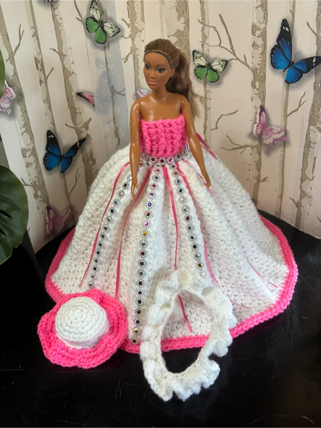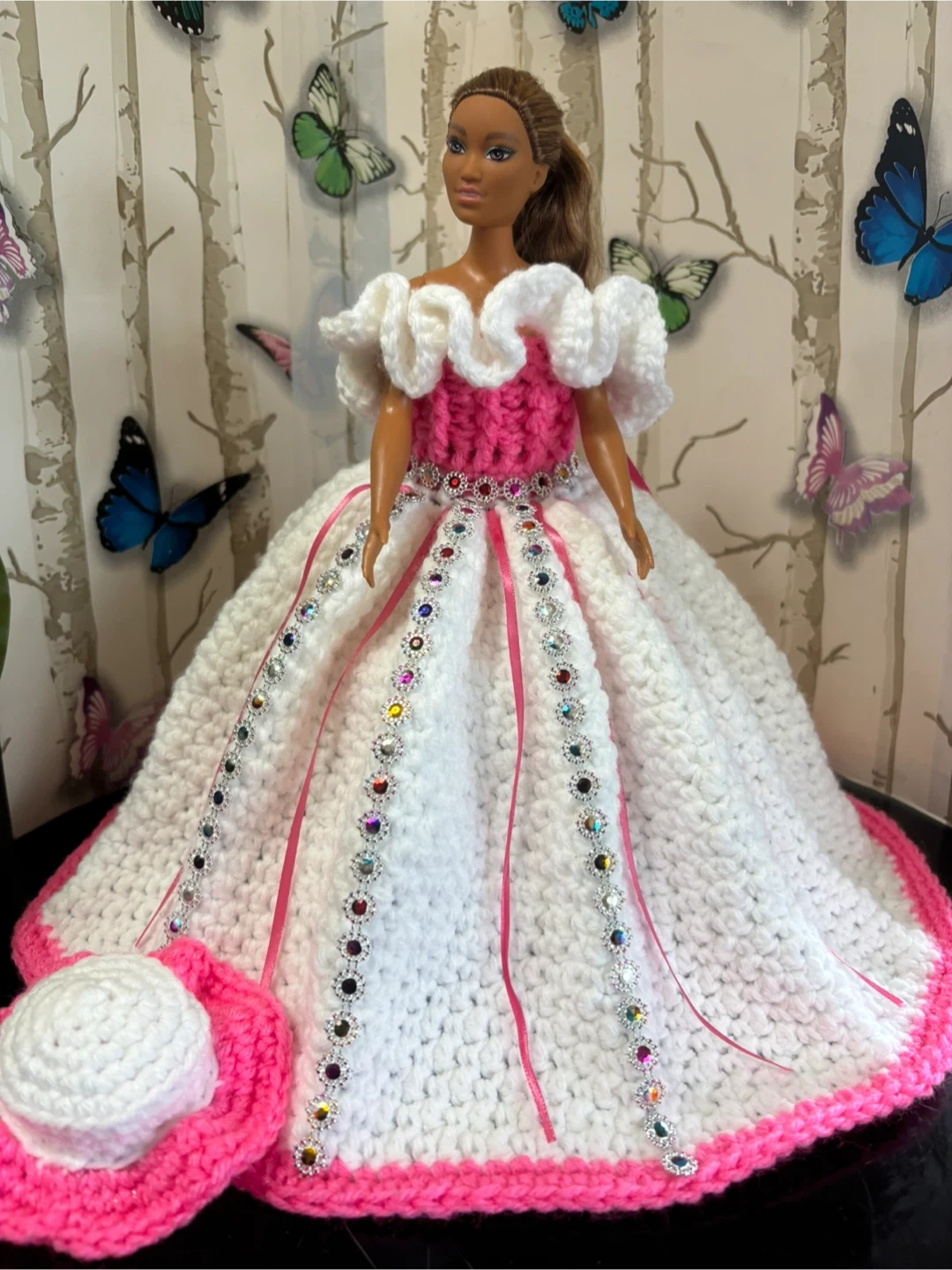 Check out this beautiful, handmade crocheted dress for a Barbie doll! It features a lovely white and pink design with delicate embellishments. It also comes with a matching hat and separate ruffles in case you want to change the look. Also comes with Barbie doll. Surely a perfect gift for someone you love.