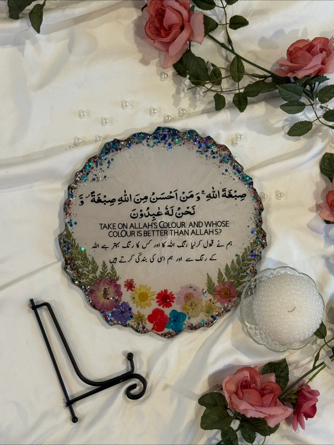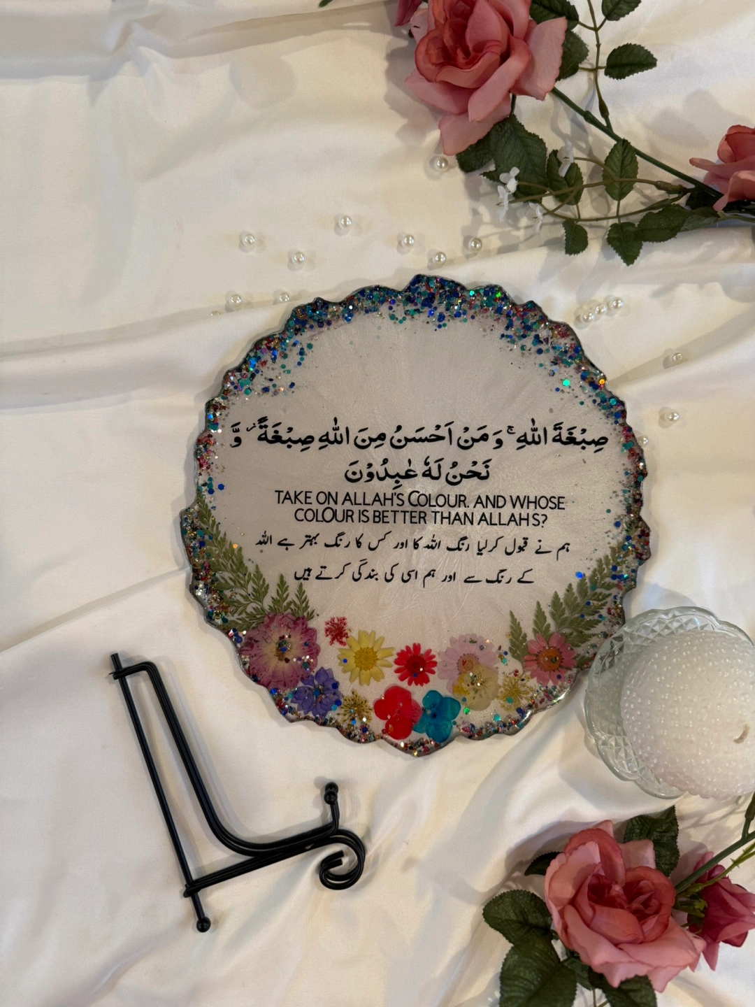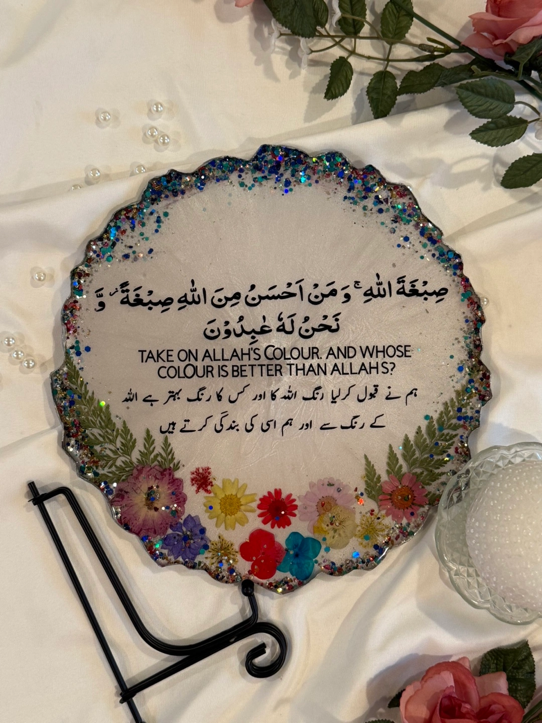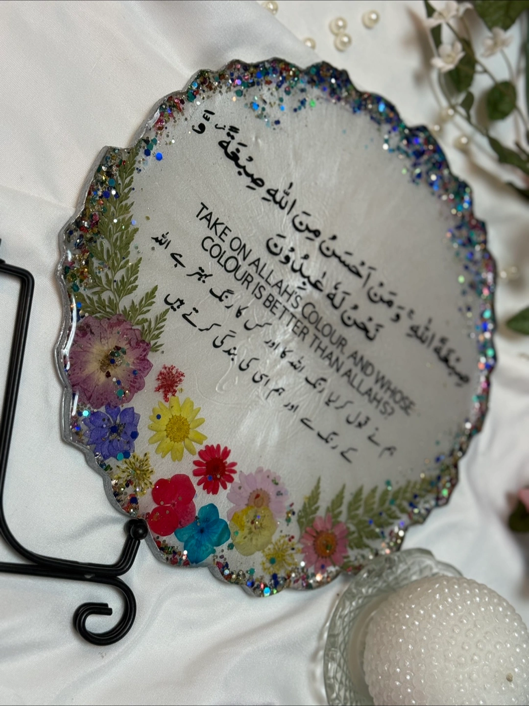 This is a beautiful, handmade decorative plate featuring a unique floral design. It has a white background with colorful flowers and a glittery edge. Perfect for adding a touch of elegance to any room!