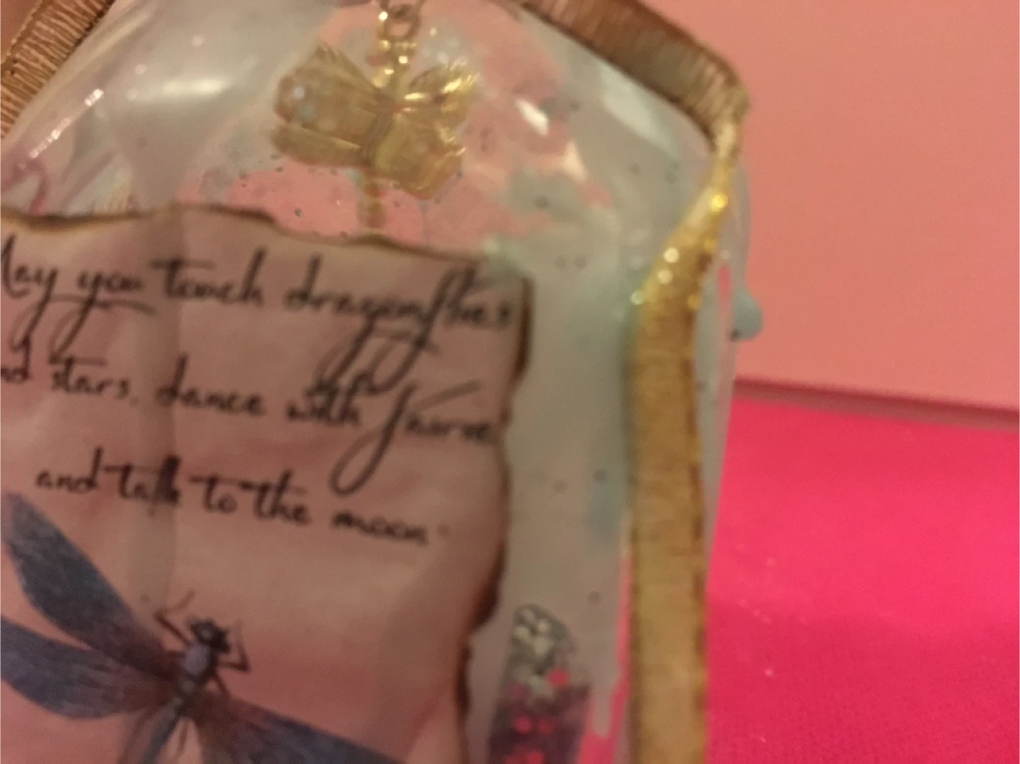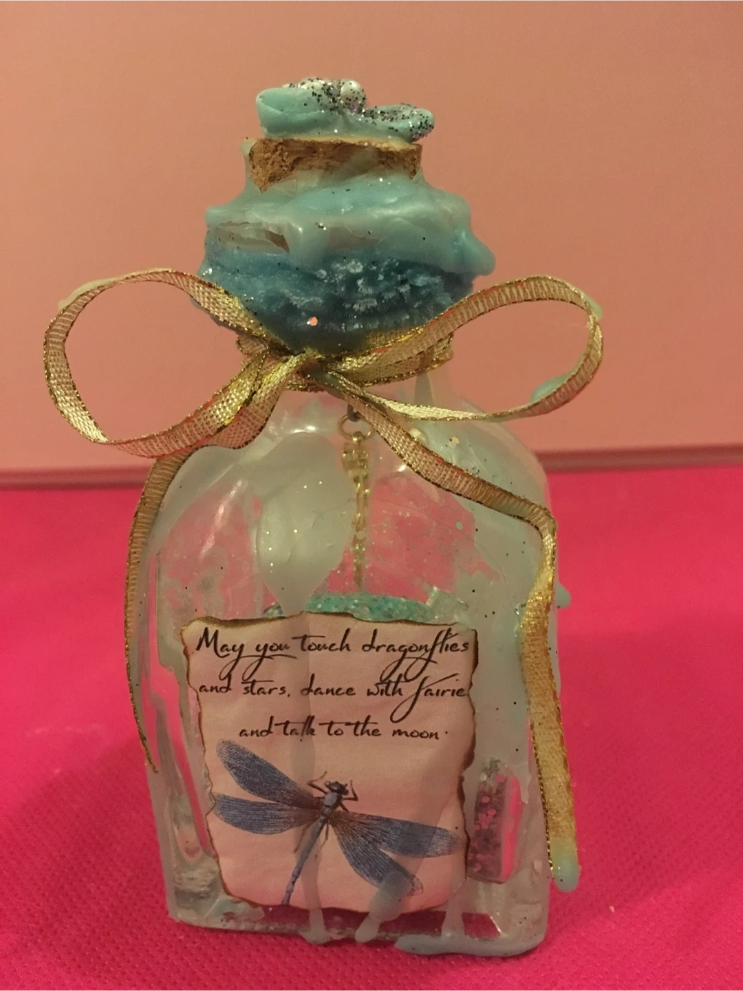 71This is a handmade decorative potion bottle. It features a light blue wax seal, gold ribbon, and a dragonfly image with the quote "May you touch dragonflies and stars, dance with fairies, and talk to the moon"