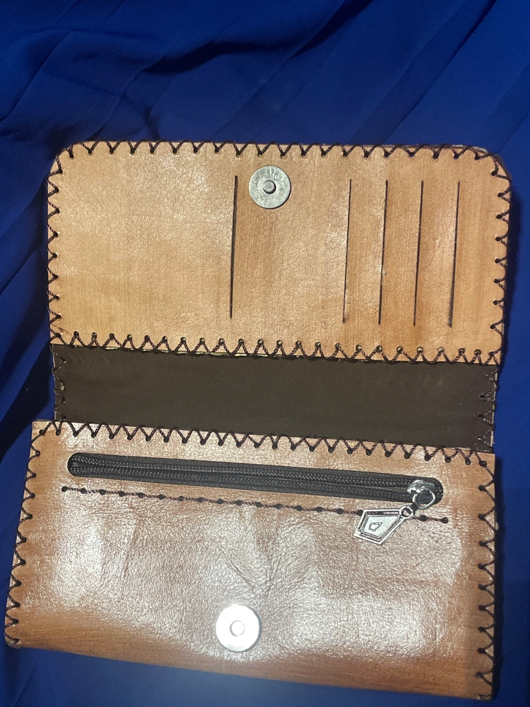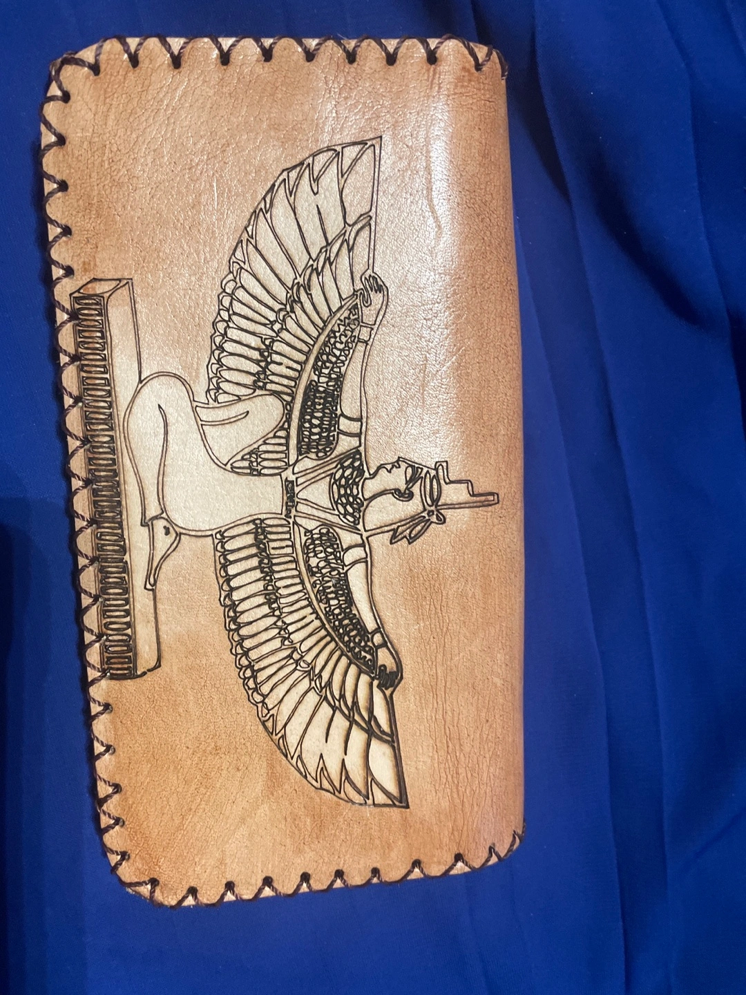Selling a unique handmade leather wallet! It features a beautiful winged figure design etched into the leather. The wallet has several card slots and a zippered compartment for your essentials. It's in great condition and ready for a new home