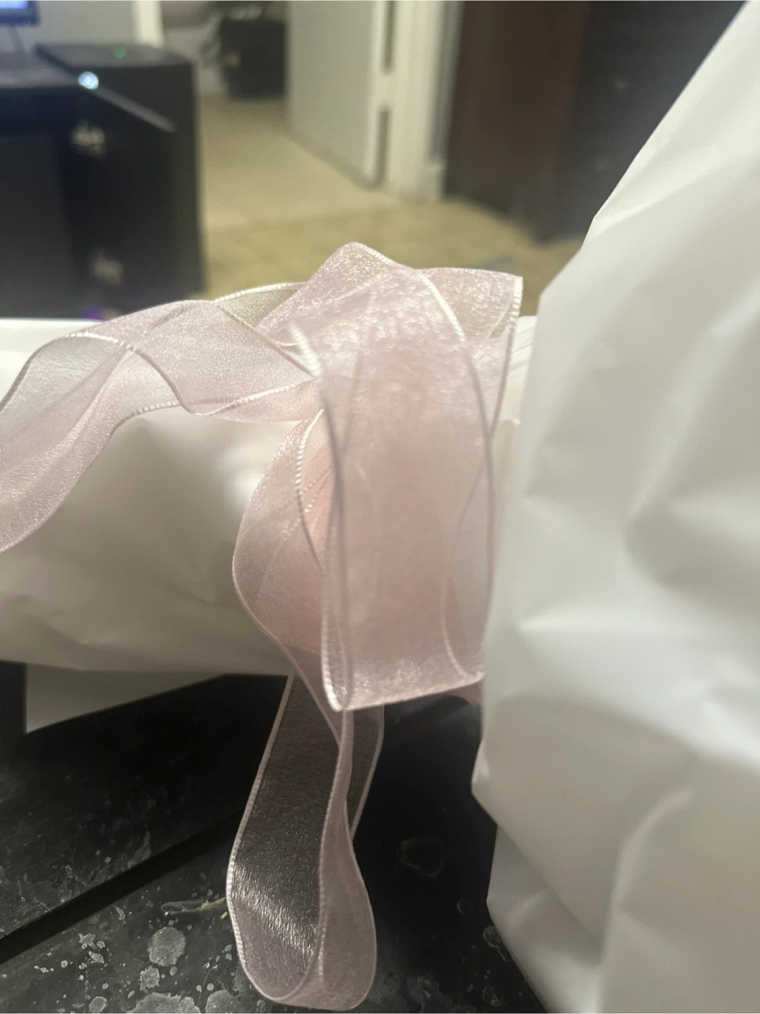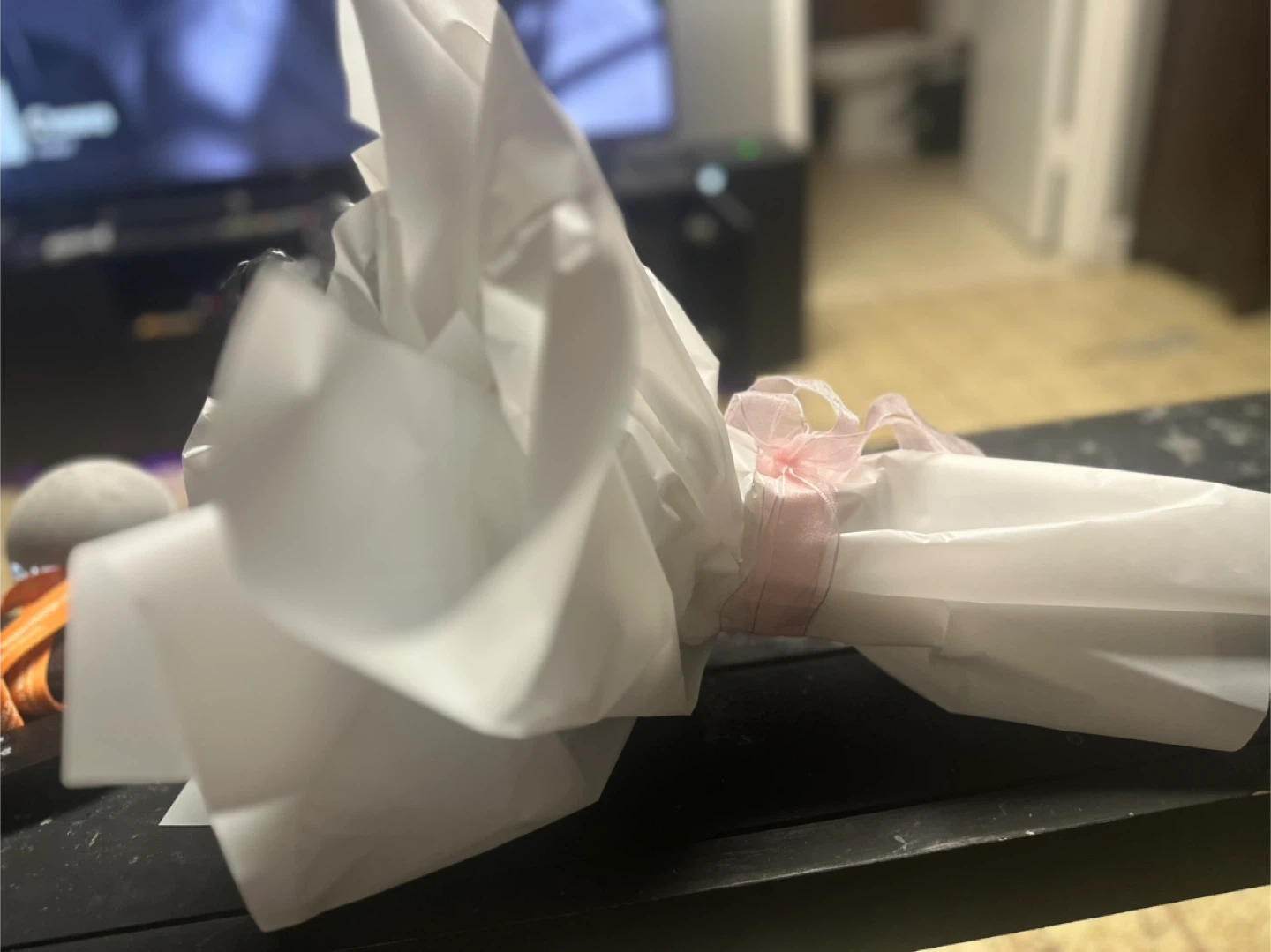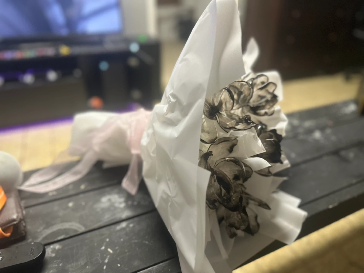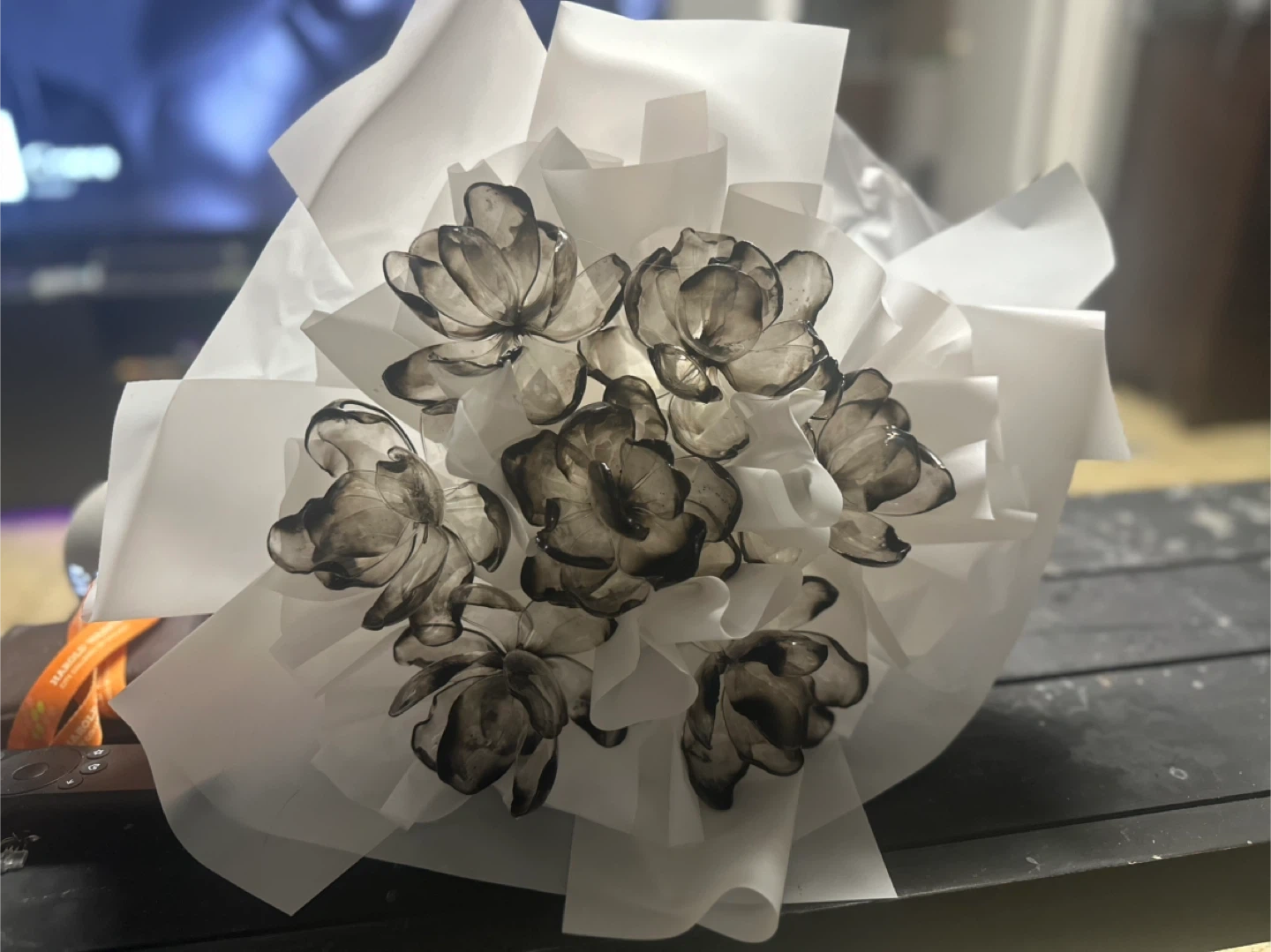 Selling a beautiful floral bouquet featuring black and white flowers handmade out of burnt plastic. It's wrapped in white paper and tied with a delicate pink ribbon. Perfect for gifting to a special being💐