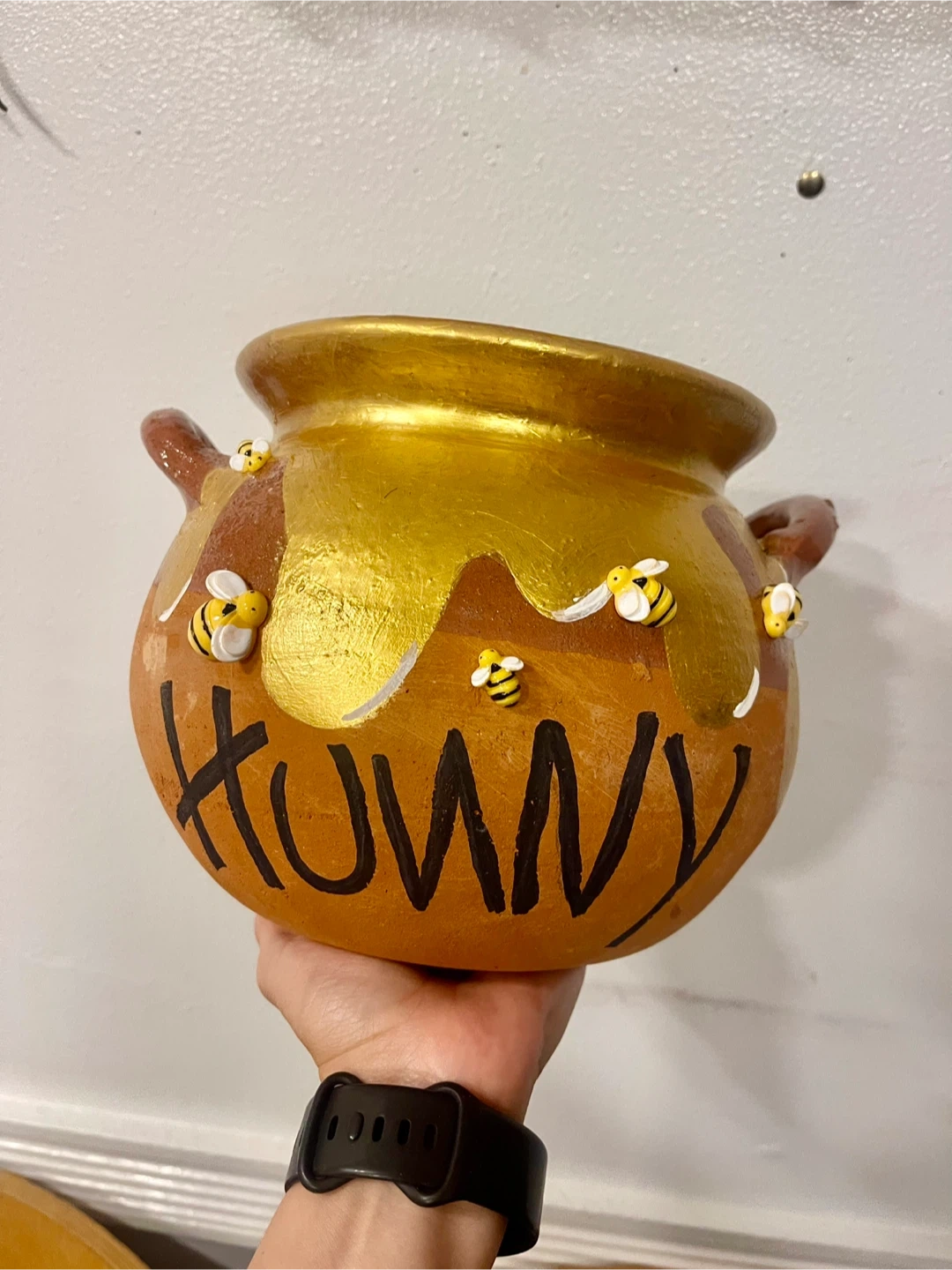 This is a handmade Hunny pot. It is brown with black lettering and gold paint. There are small bee decorations on the pot. Perfect for Winnie the Pooh lovers, gardening/ event decor. Selling a lot of 8. One of them large, 2 medium size and other small ones.