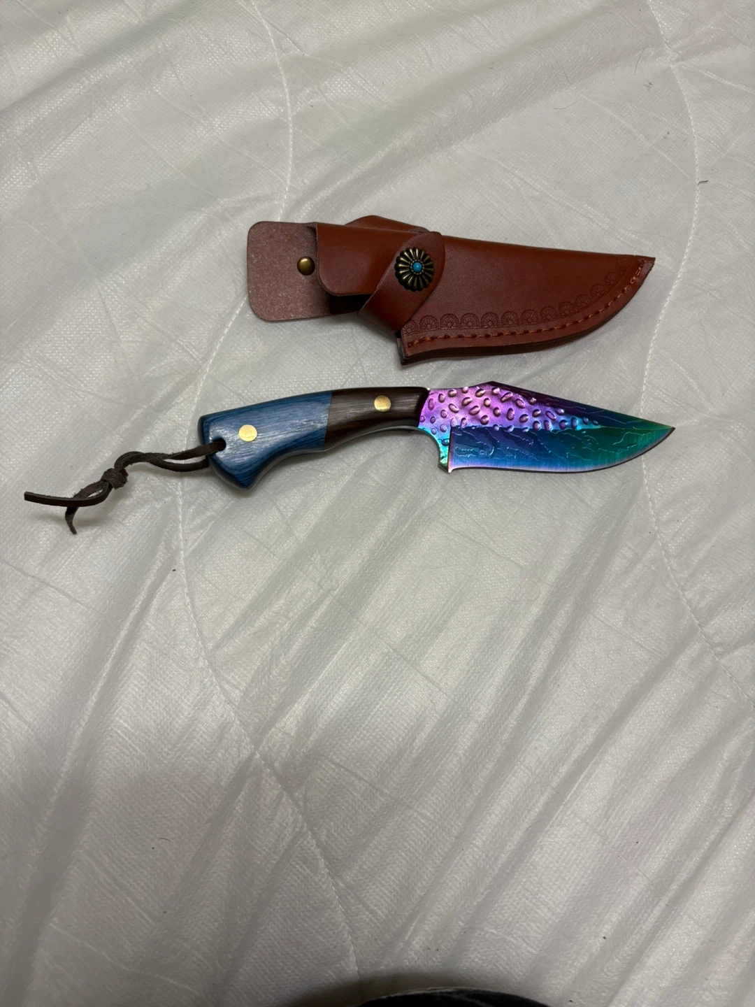 Selling a handmade hunting knife with a leather sheath. The knife has a unique iridescent blade and a blue handle. The sheath is brown leather with decorative stitching and a snap closure. It's in great condition!