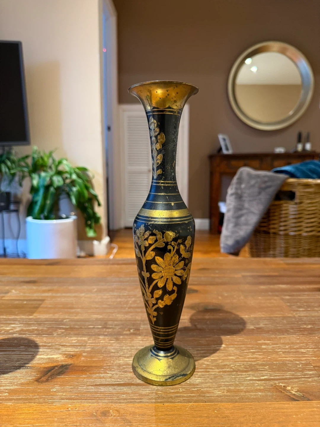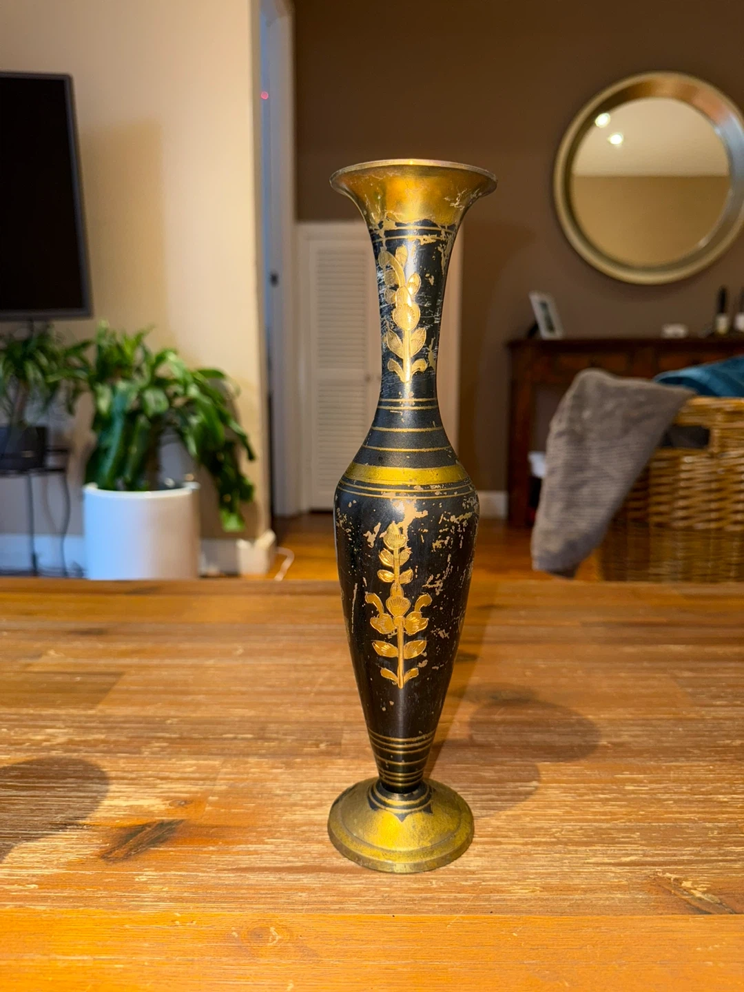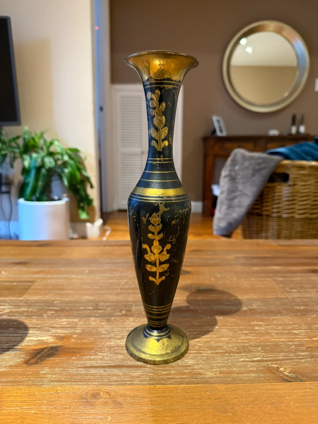 89Here's a decorative vase that was handmade in India. It has a black and gold color scheme with a floral design. It would look great in any home! There 2 of them