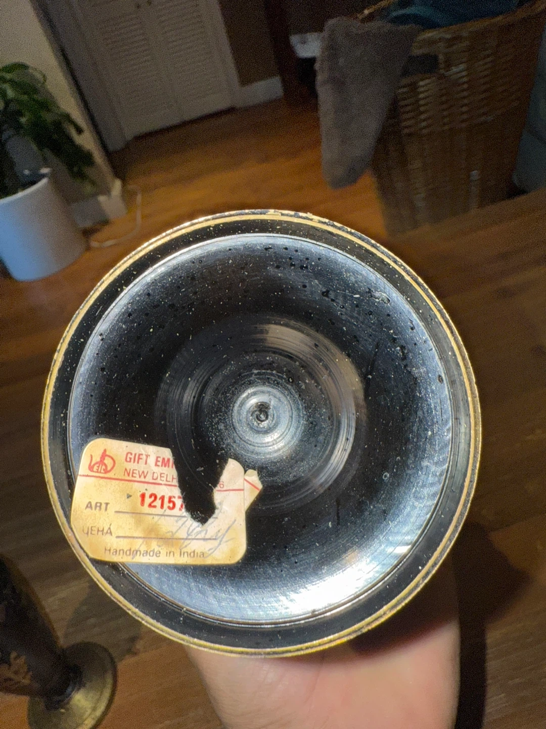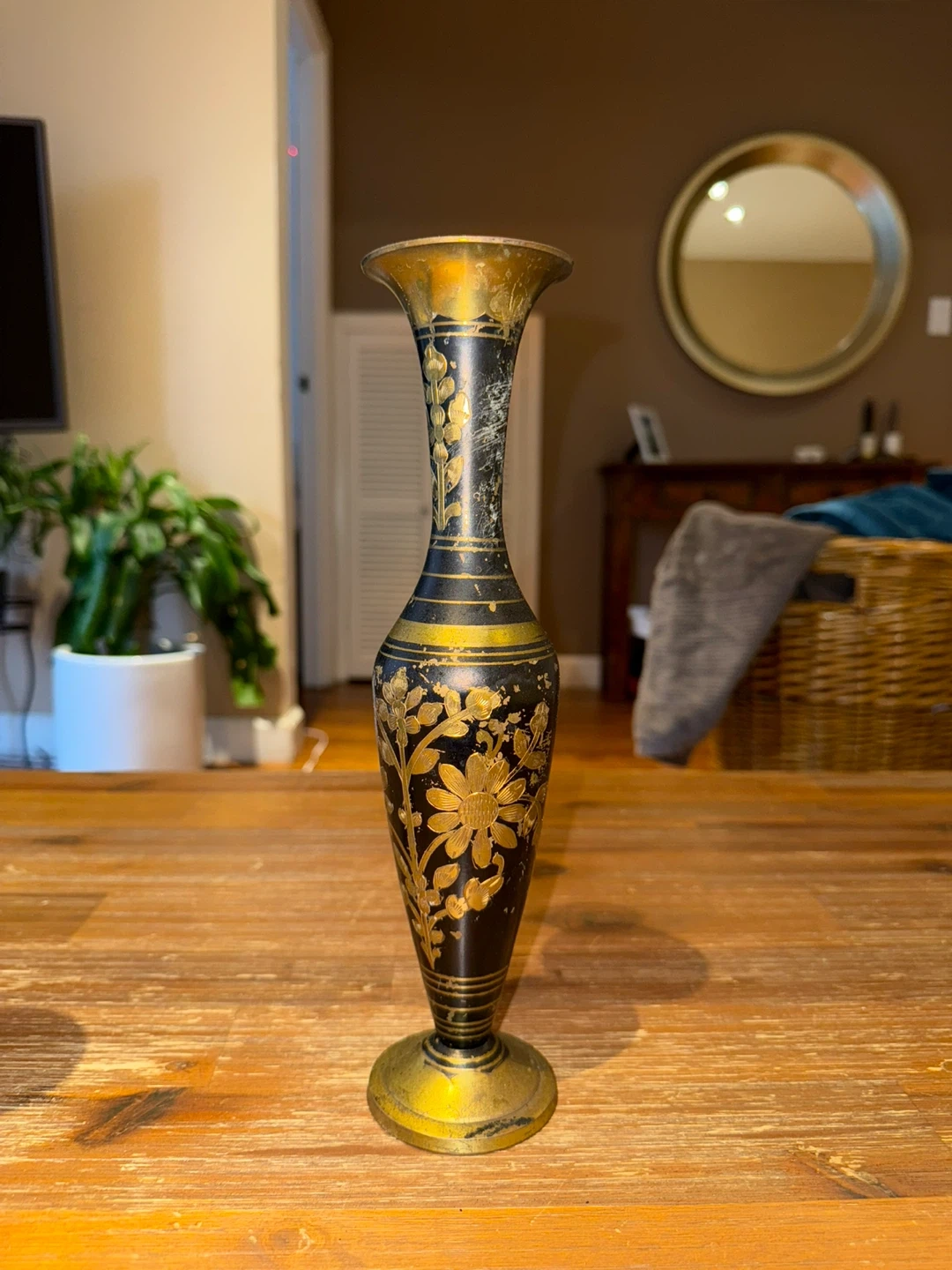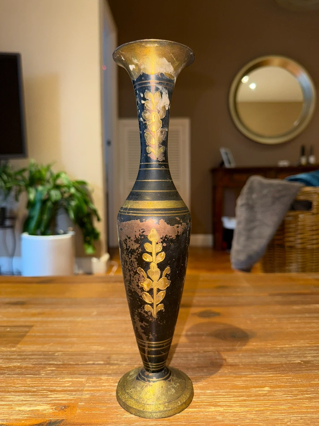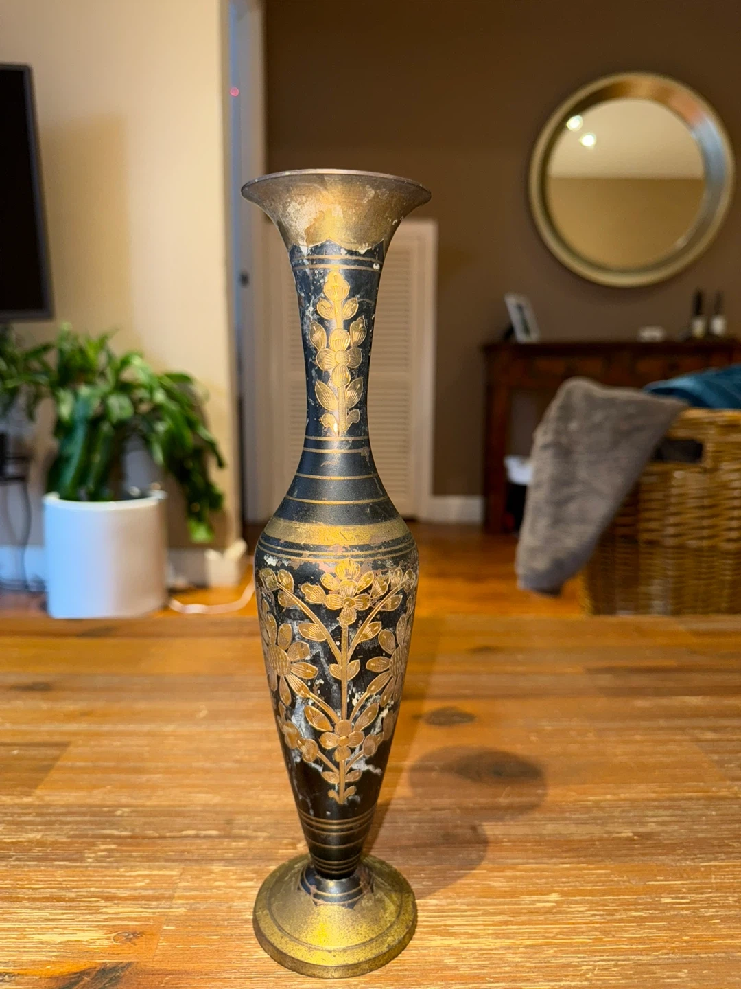 89Here's a decorative vase that was handmade in India. It has a black and gold color scheme with a floral design. It would look great in any home! There 2 of them