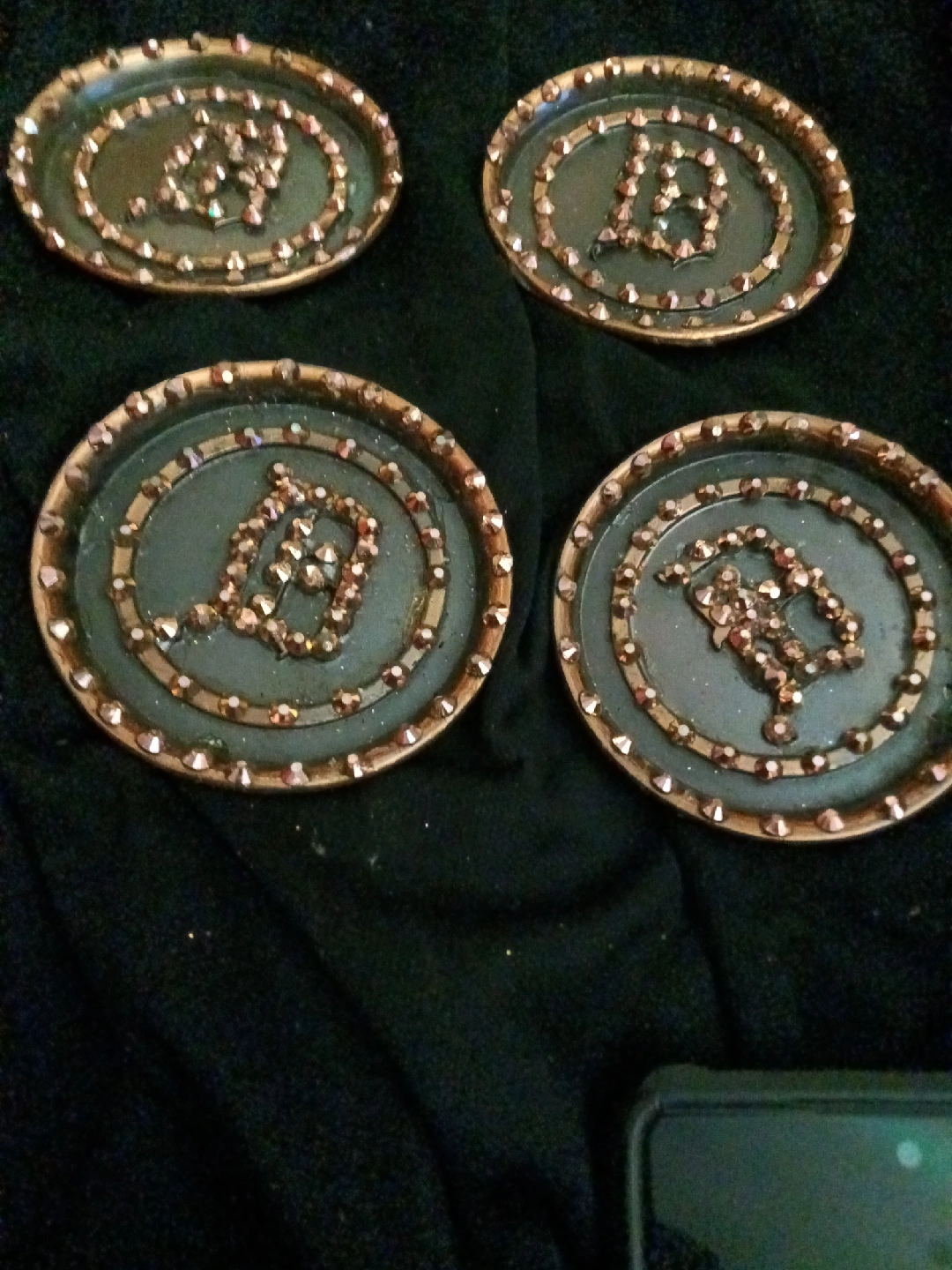 10I'm selling a set of four handmade coasters, each featuring a different initial. They have a unique design with a dark background and decorative beading. Great for adding a personal touch to your home decor!