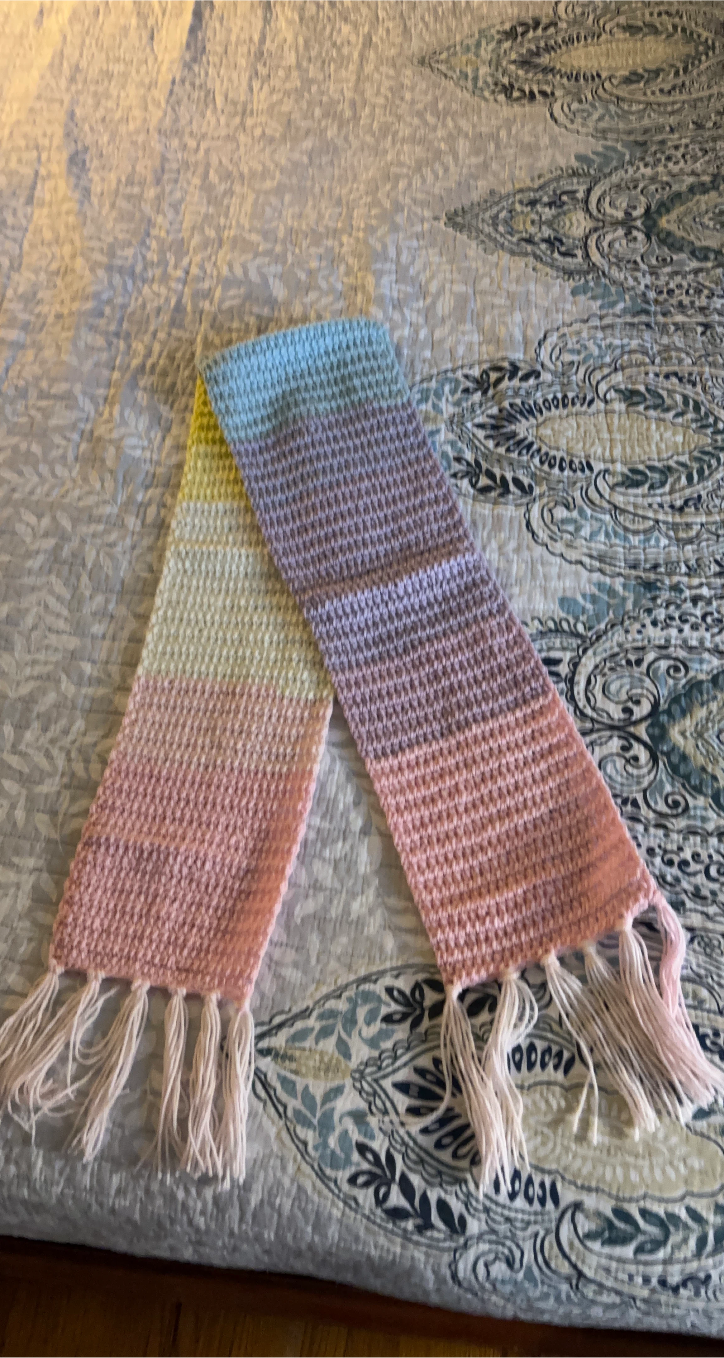 Selling a handmade knitted scarf with a lovely pastel color gradient! The scarf features fringe detailing and a soft texture. Perfect for adding a cozy touch to any outfit