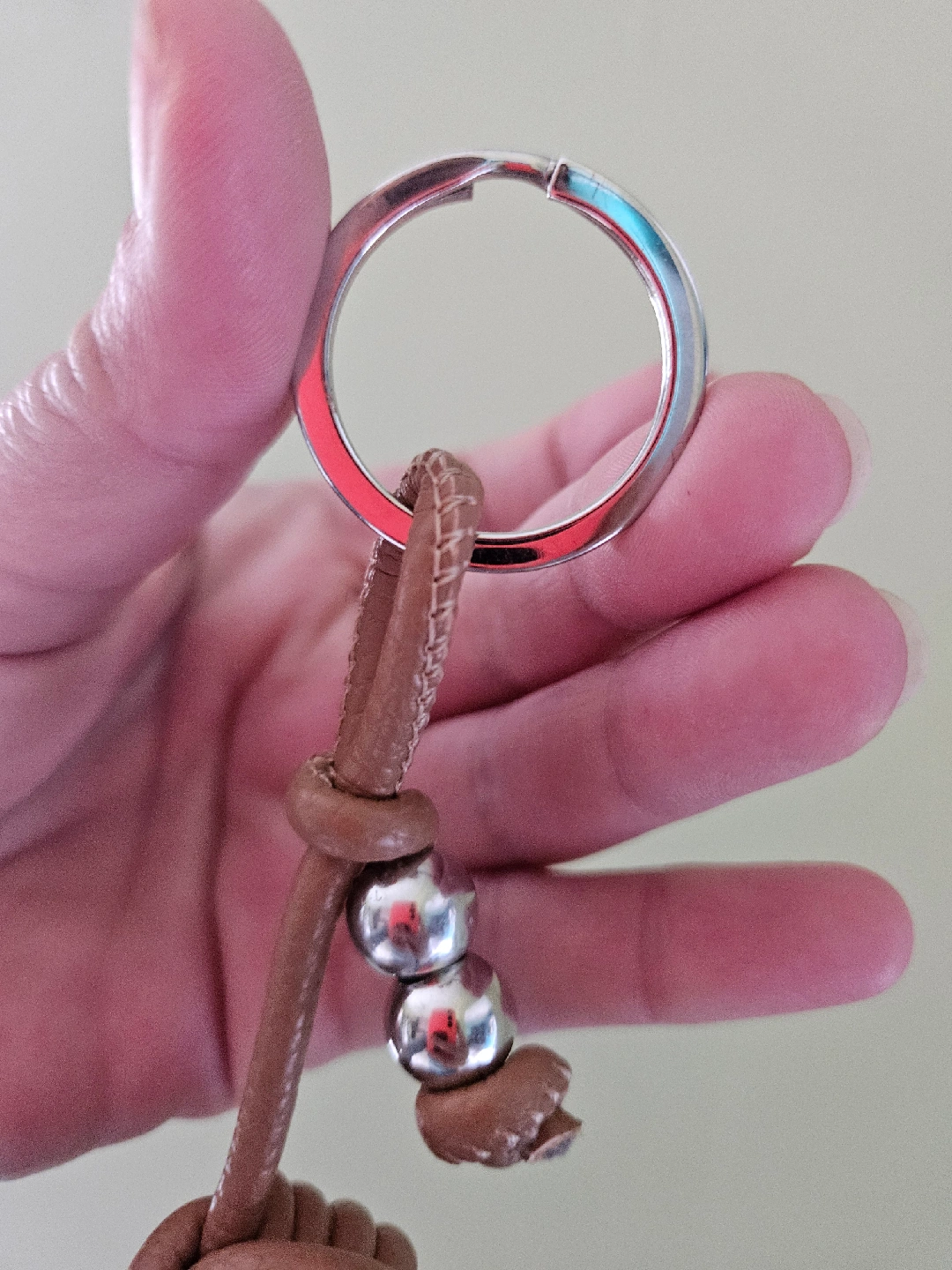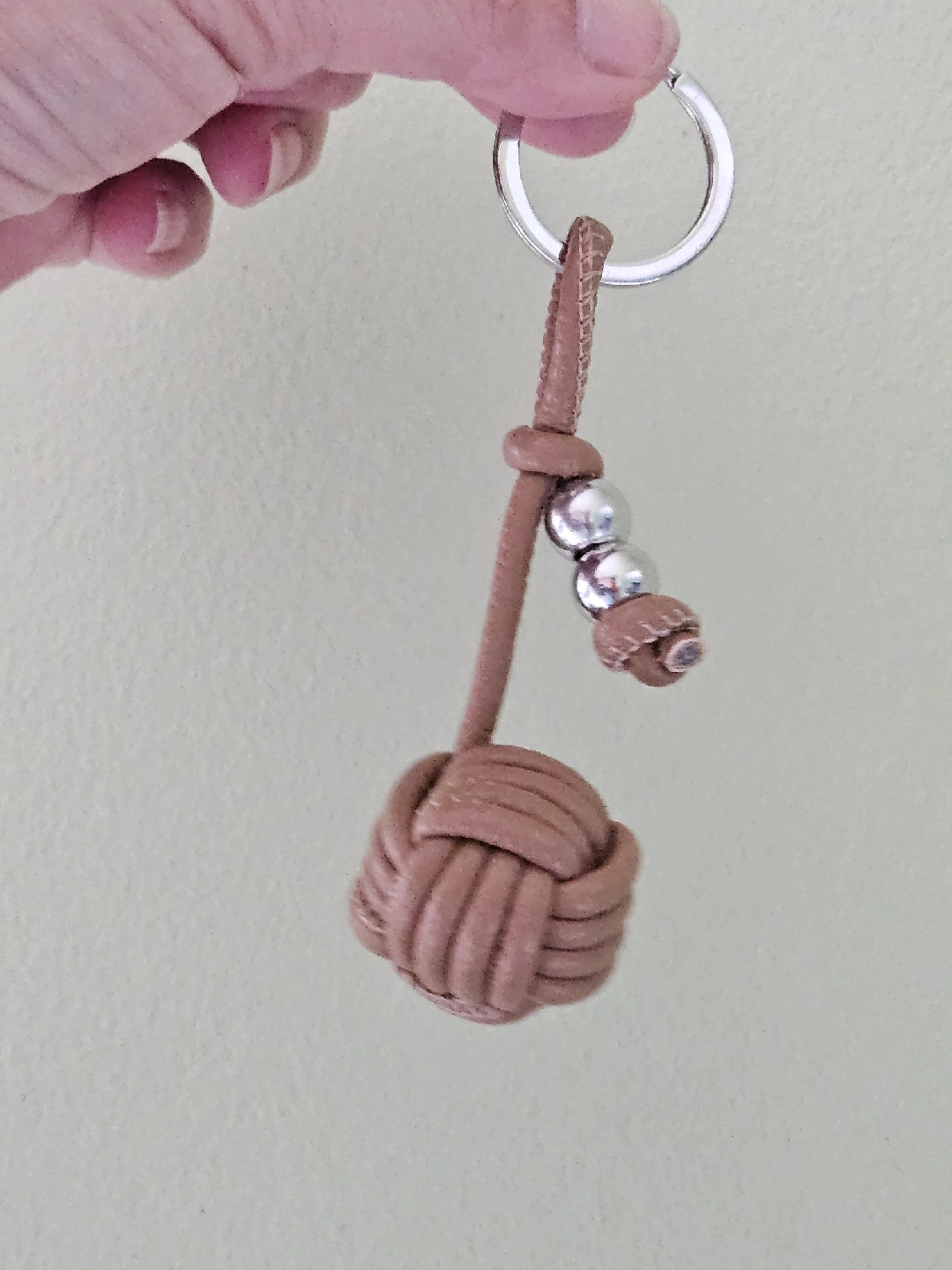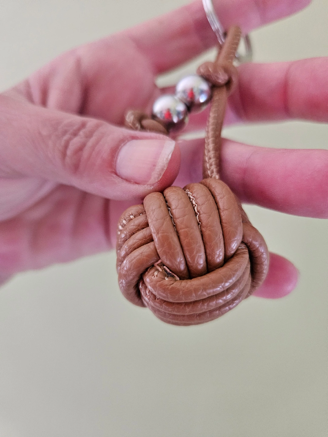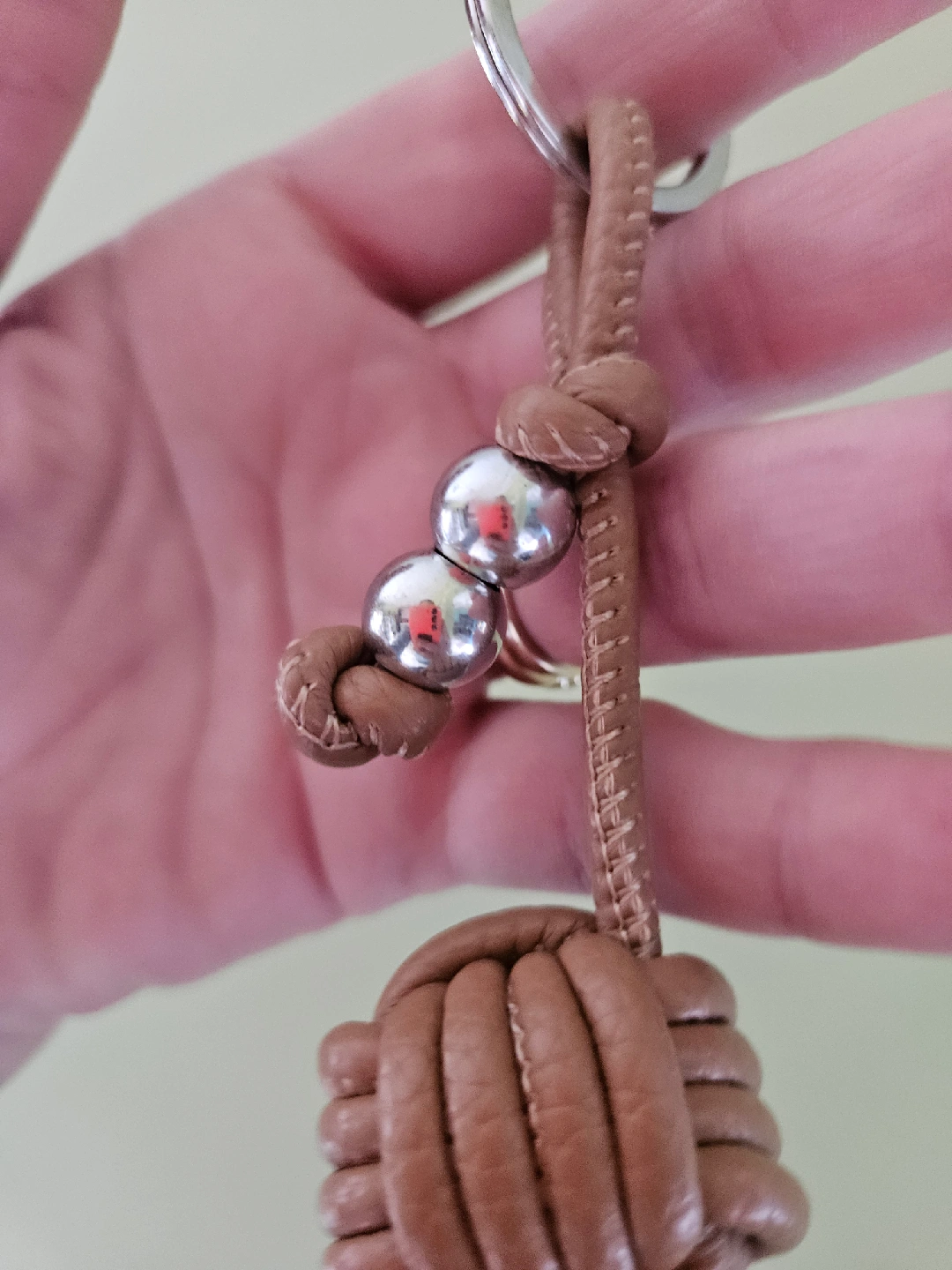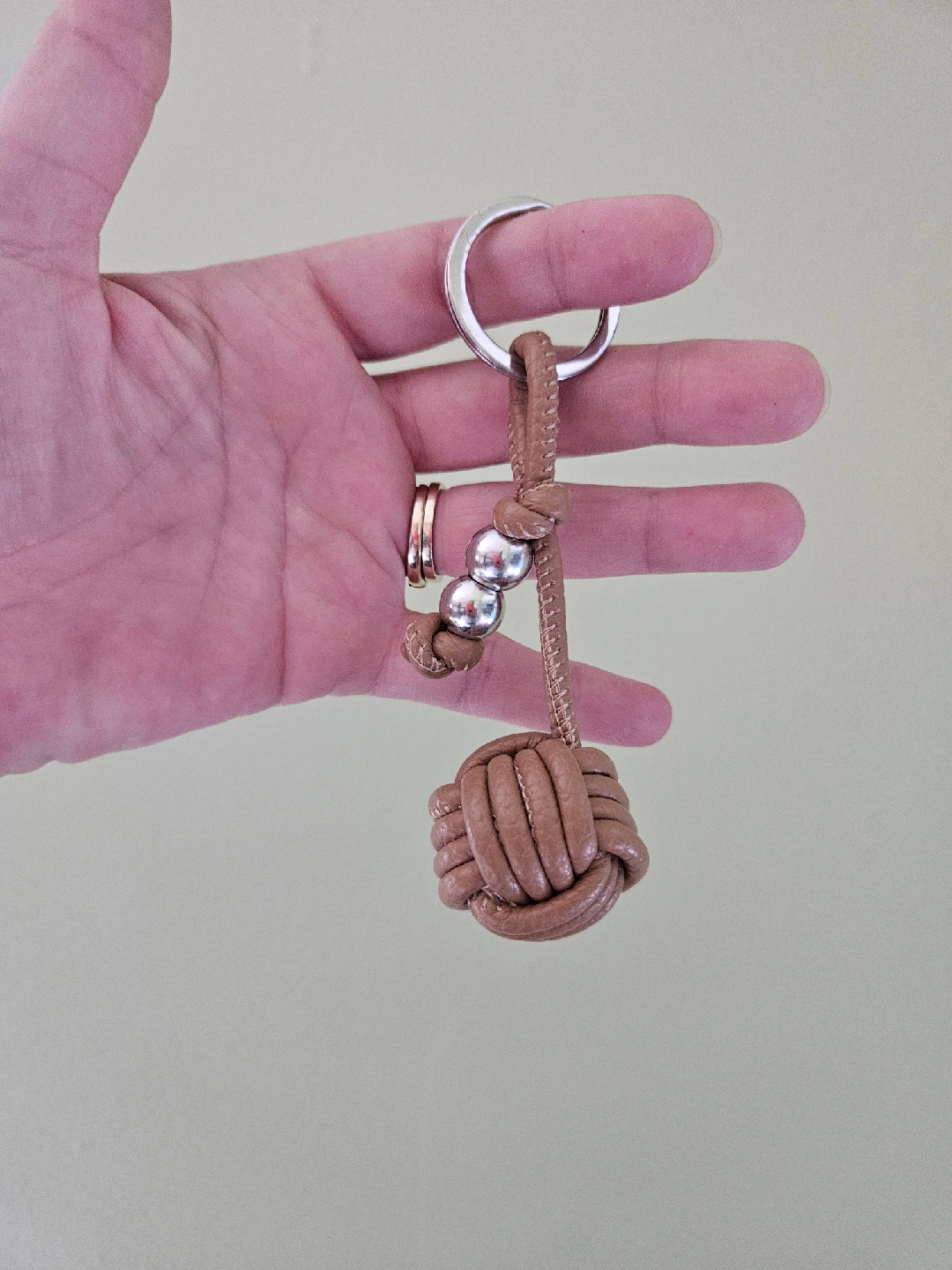 36Selling a handmade leather knot keychain. It features a unique knotted design with silver-colored beads. The keychain is in good condition and ready to add some style to your keys!