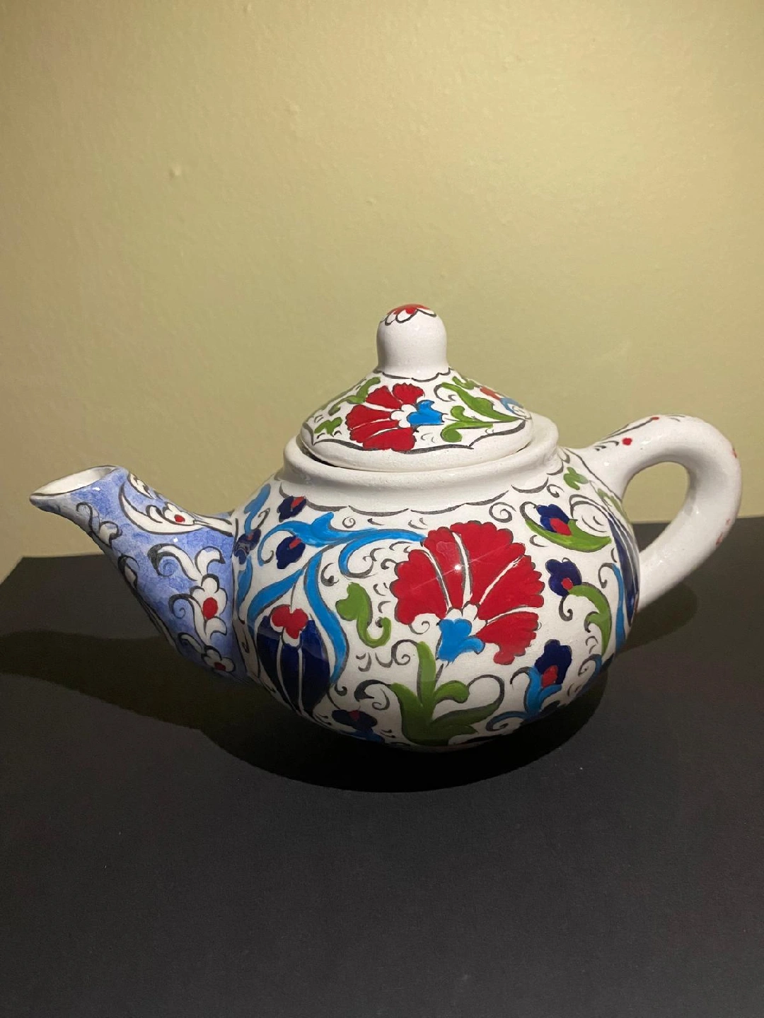Selling a beautiful handmade Orient Iznik teapot. It features intricate floral designs in red, blue, and green. This unique teapot would make a lovely addition to any collection