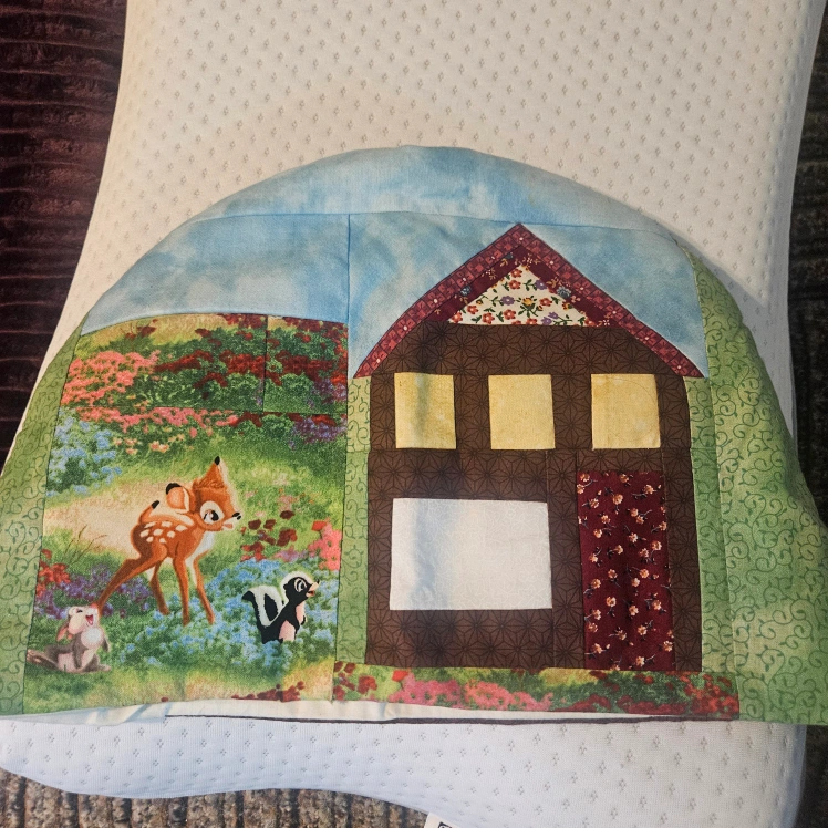 This is a handmade cover poster a unique design! It features a charming house scene on one side and a geometric pattern on the other. It's in great condition and ready to add a touch of whimsy to any room