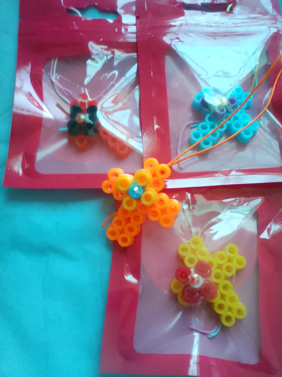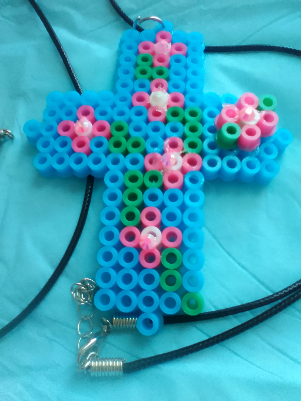 Here are some handmade cross necklaces made from Perler beads! These are unique and colorful accessories.