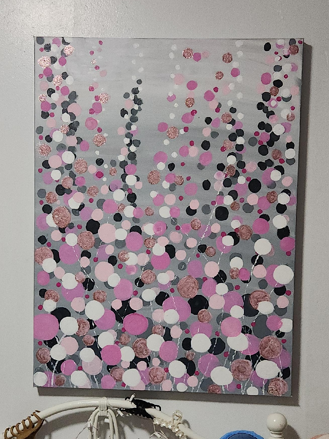 This is a handmade canvas art piece featuring a polka dot design in shades of pink, gray, black, and white. It would look great in any room!