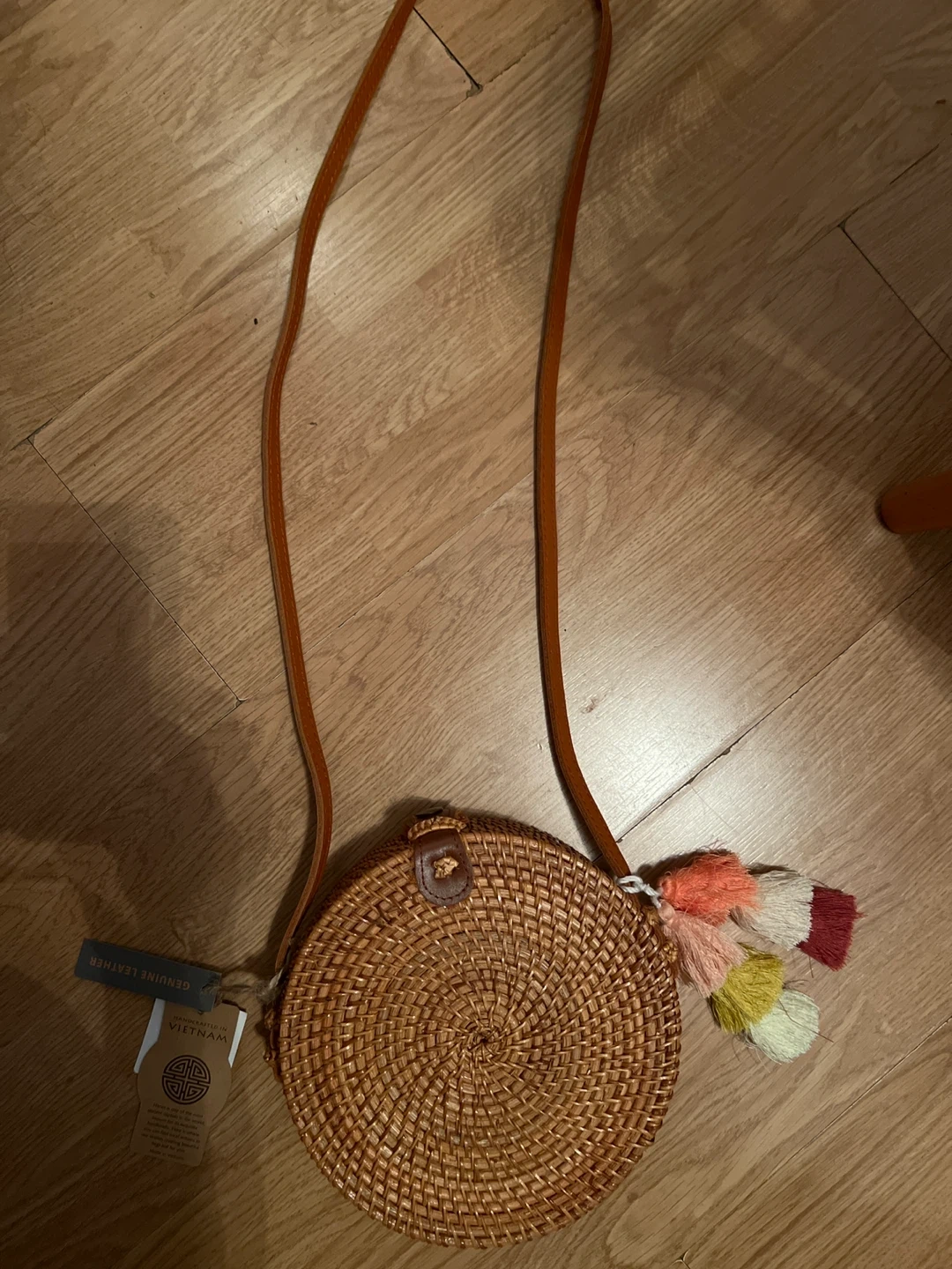 33Check out this cute, brand new, hand crafted in Vietnam, round crossbody bag! It's made of rattan and has a genuine leather strap. The bag also features colorful tassel details. It's light and durable, perfect for everyday use!