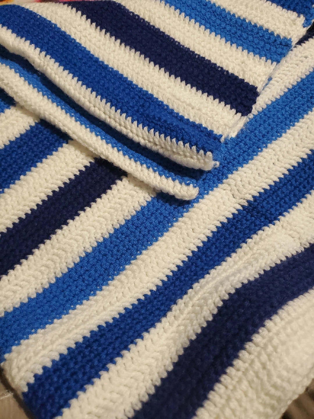 Selling a cozy, handmade crochet blanket. It features a striped pattern in shades of blue and white. Perfect for adding a touch of warmth and charm to any room. It is made for a toddler size bed.