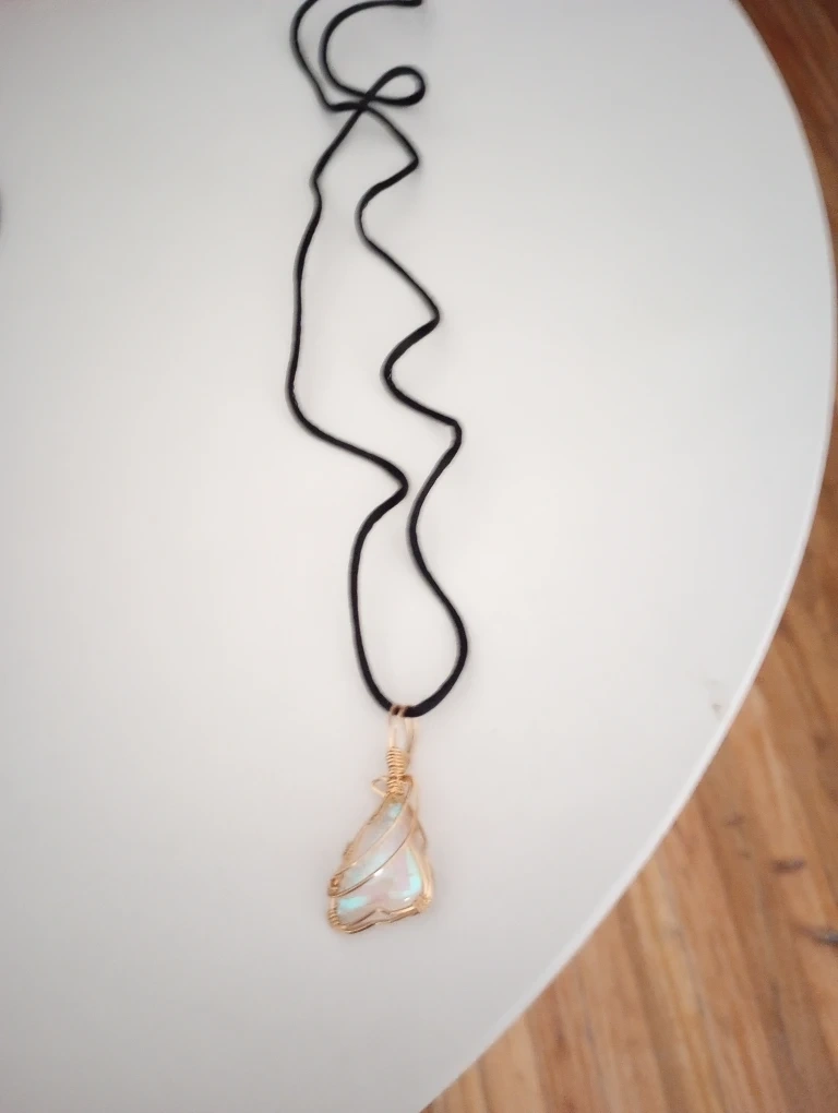 10This is a beautiful handmade necklace featuring a wire-wrapped crystal pendant. The necklace has a unique and elegant design, perfect for adding a touch of sparkle to any outfit