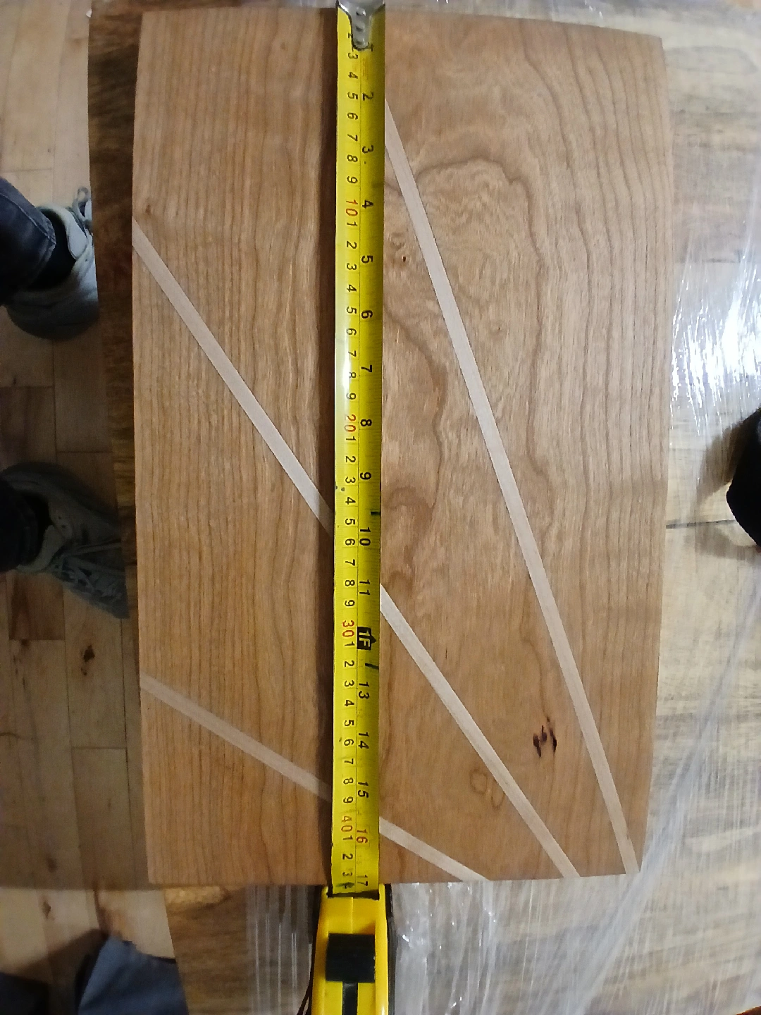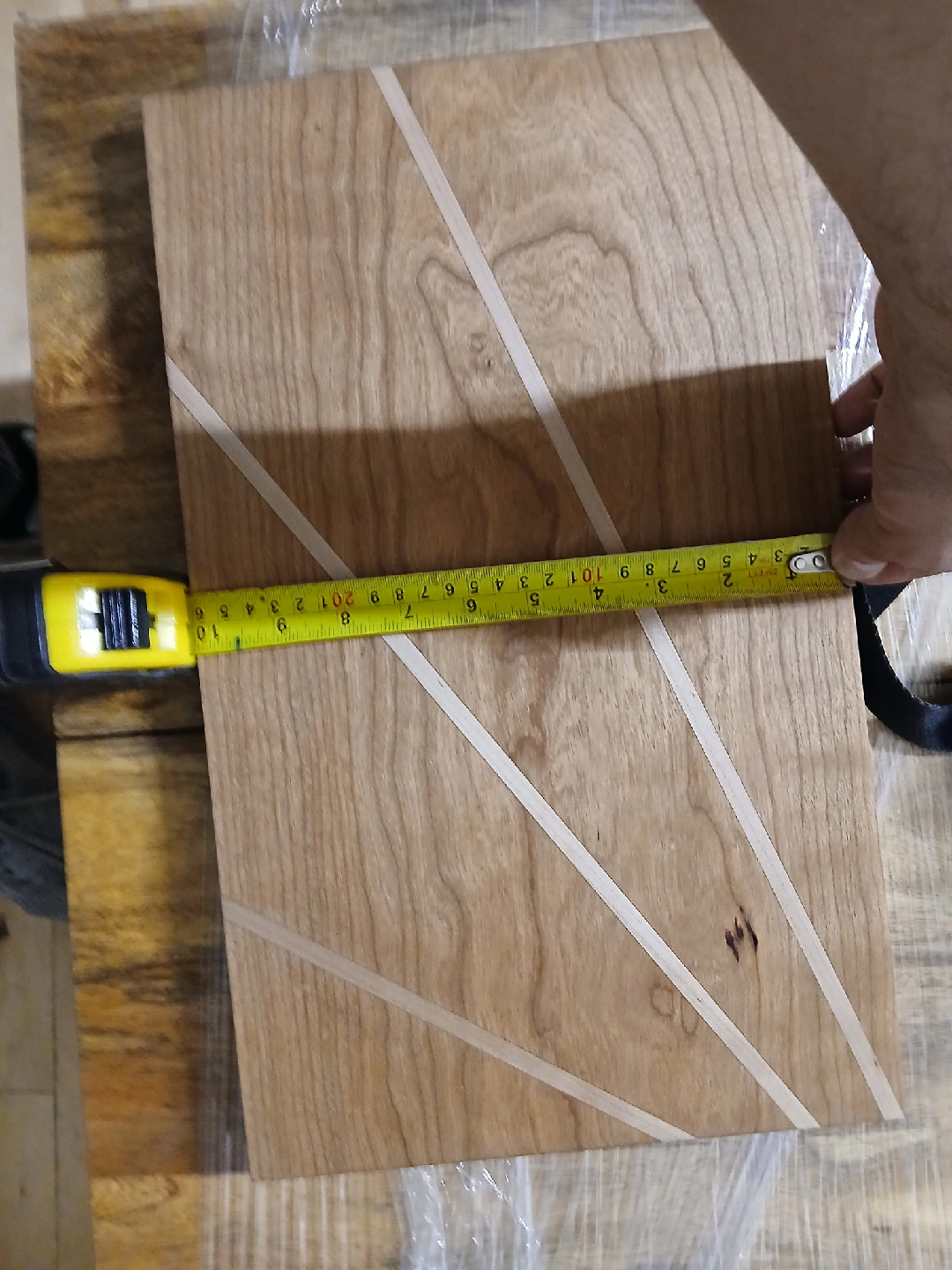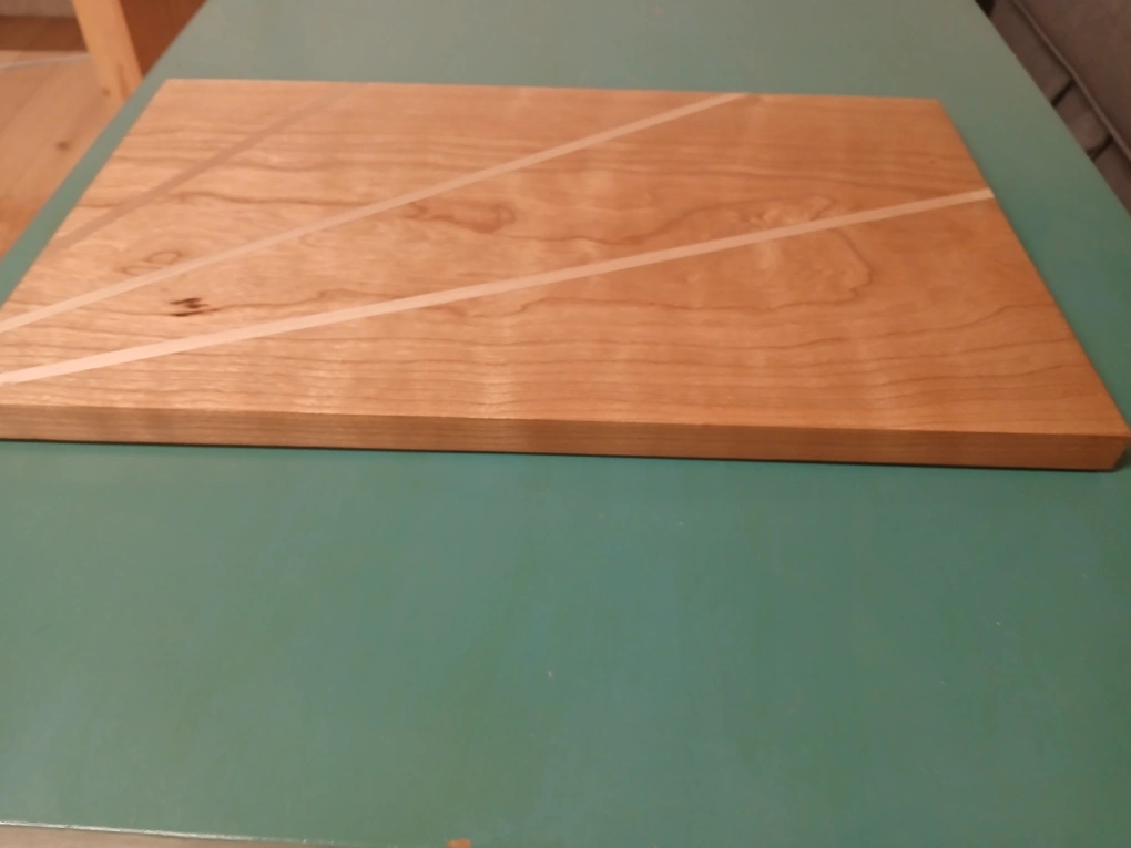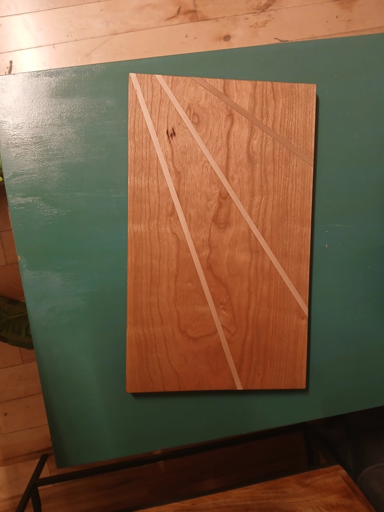 Selling a handmade wooden cutting board. It's in great condition and ready for a new home! The board features a unique design with inlaid stripes. It's made of walnut and handmade