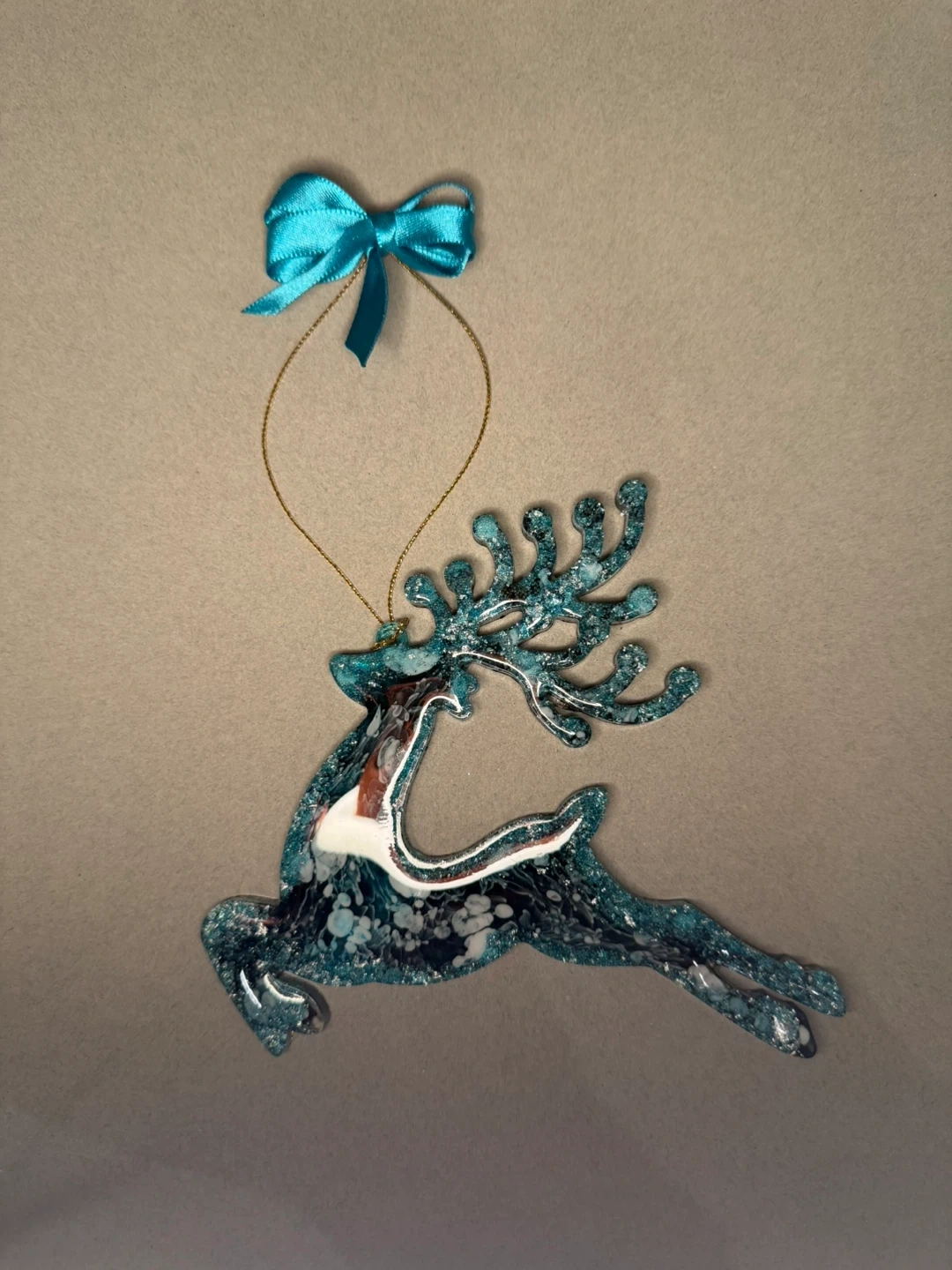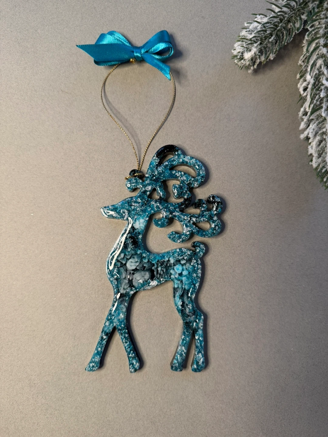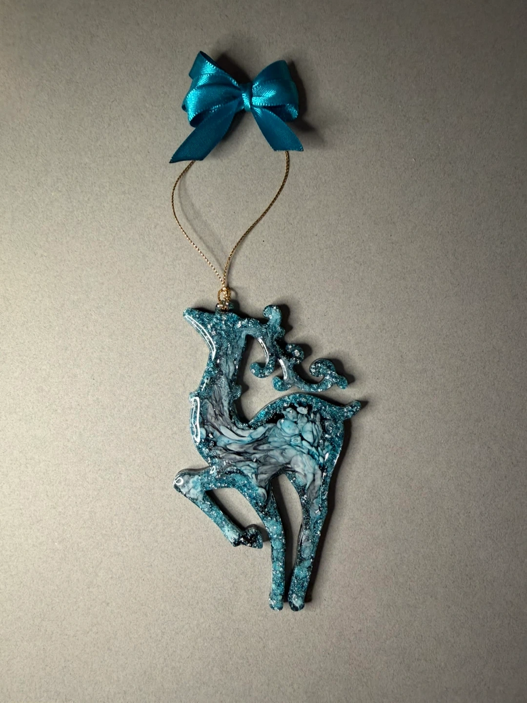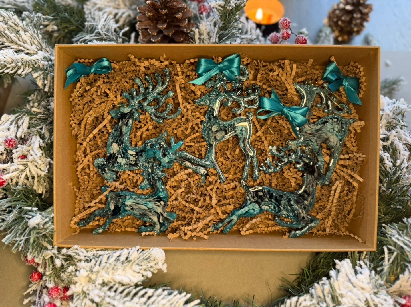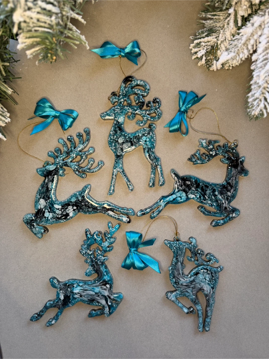 Handmade set of 5 reindeer in marbled blue-black resin. Approx. 5” tall with built-in holes for hanging. Glossy finish, lightweight, one-of-a-kind. Handcrafted in a limited batch using premium low-viscosity resin and Pantone-inspired winter tones. Each piece is unique.