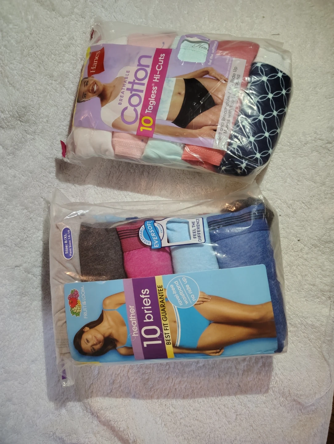 15I have two packs of women's underwear for sale. One pack is Hanes Cotton Breathable Tagless Hi-Cuts, and the other is Fruit of the Loom Heather Briefs. Both are size 8/XL and come with 10 pairs in each pack