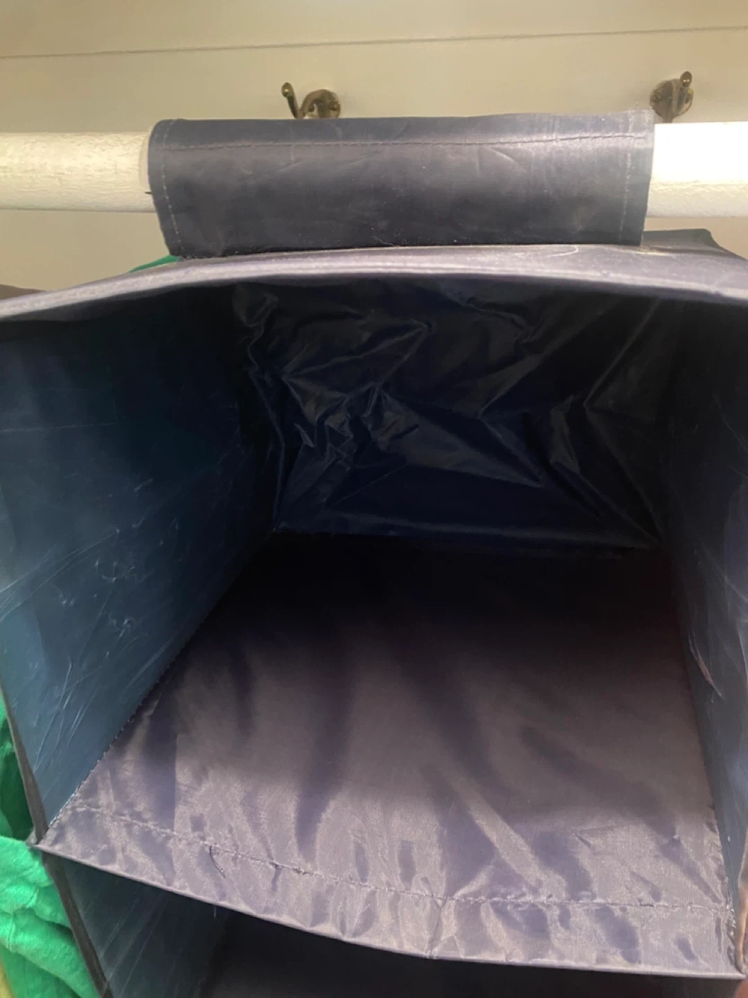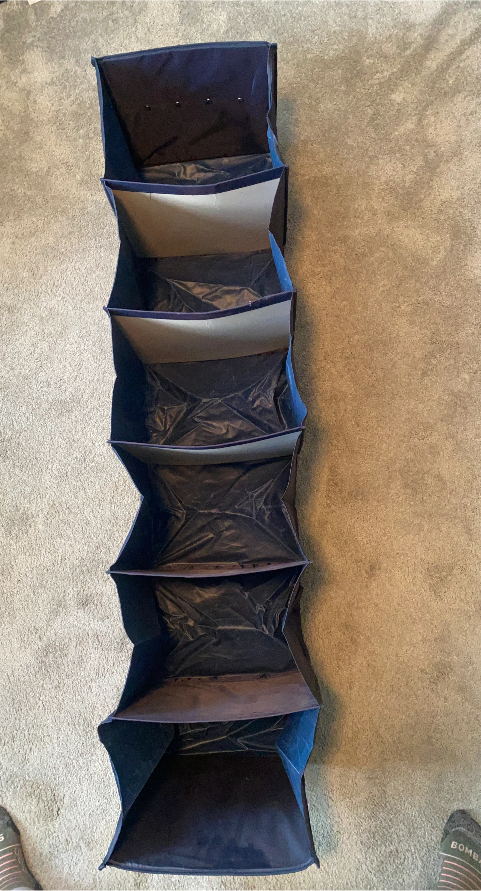 125Perfect for adding extra storage space in your closet. It has 6 shelves for organizing your clothes, shoes, or other items. Has two tears in the top compartment, but does not affect use.