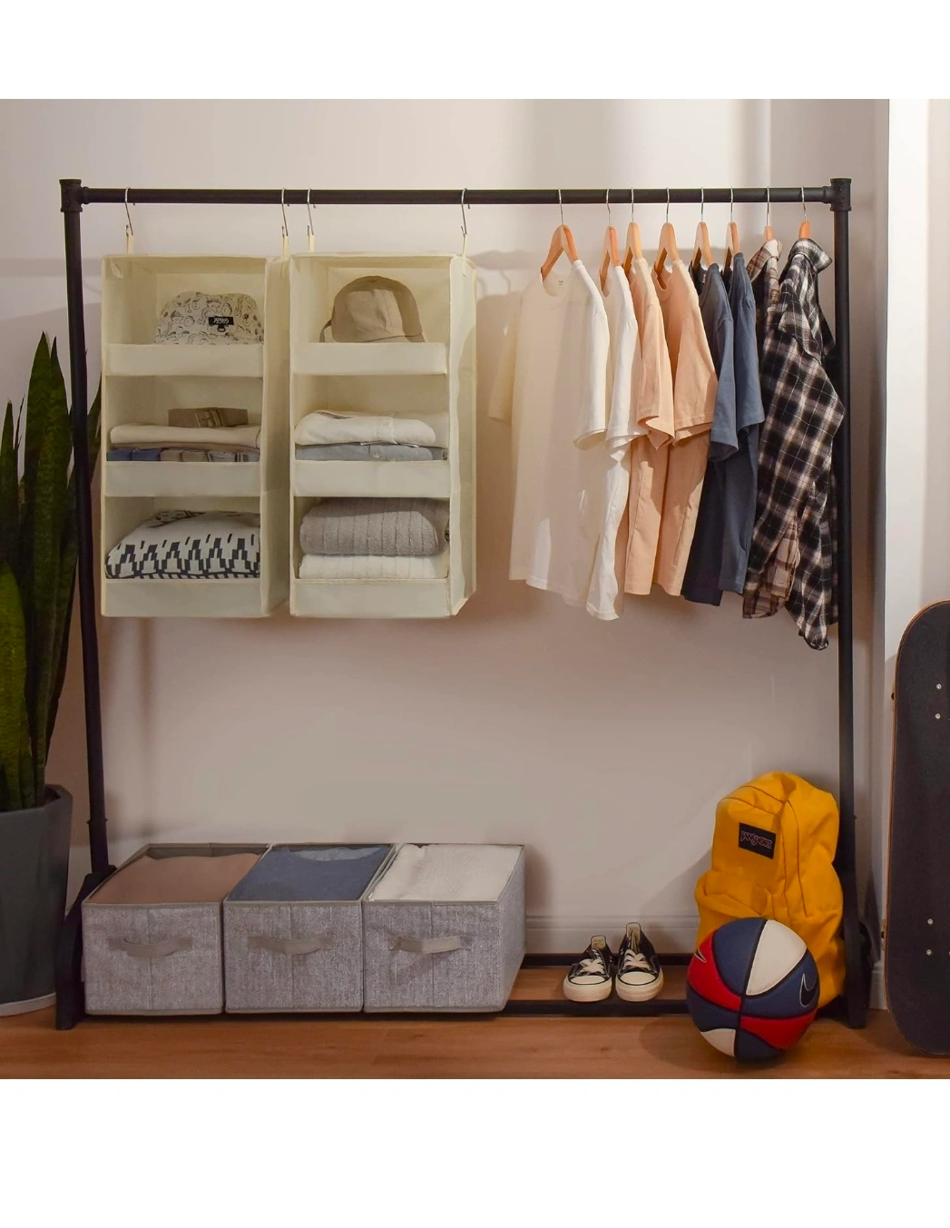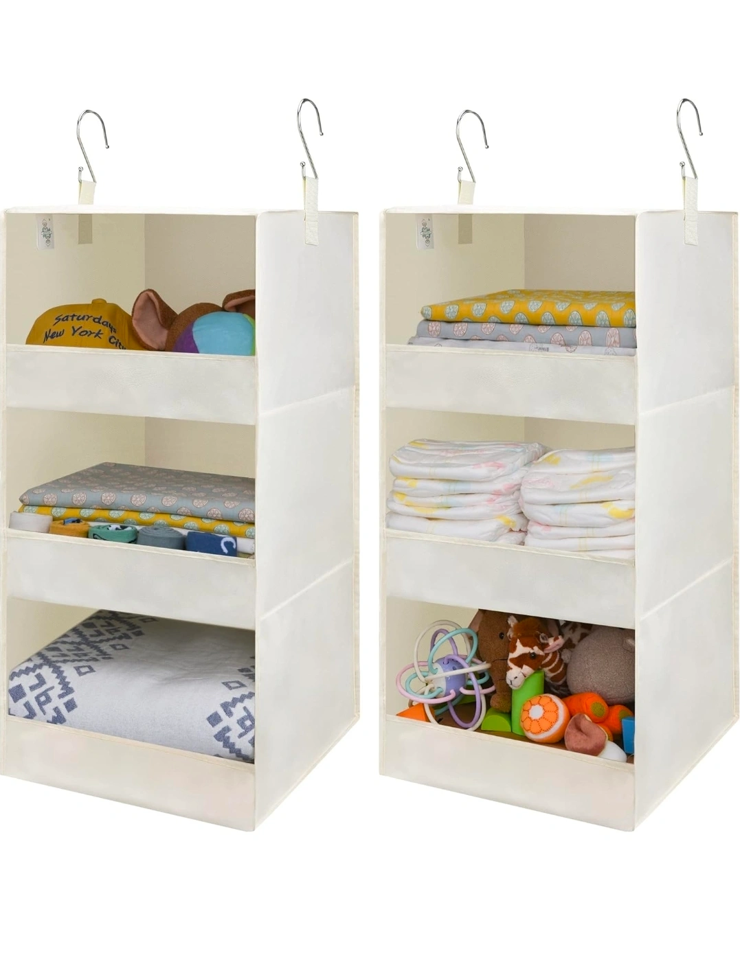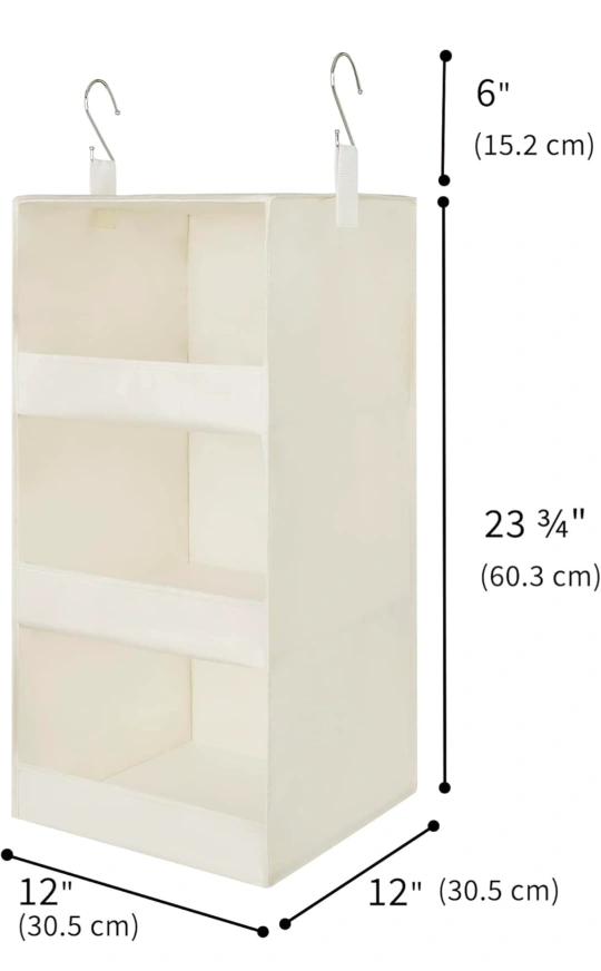 118Declutter your closet with this handy hanging organizer! It features 4 spacious shelves to neatly store clothes, accessories, or even baby items. The beige color blends seamlessly with any decor. It's also washable for easy cleaning and folds for compact storage when not in use. Dimensions are approximately 6" x 12" x 23.75".