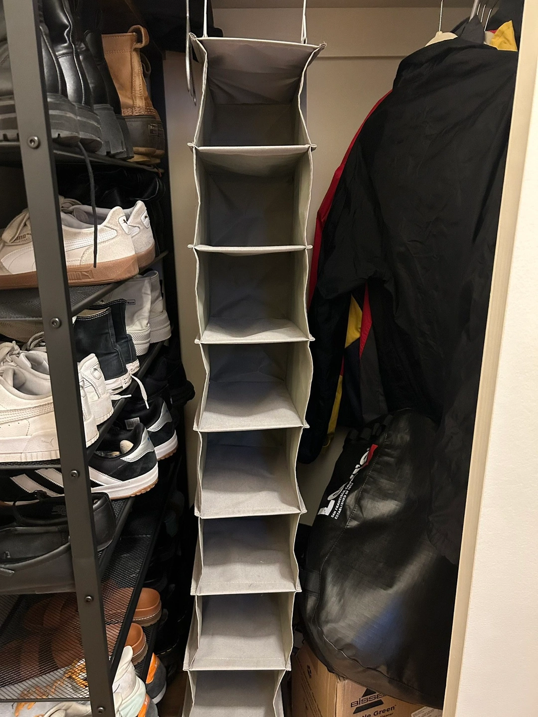 282x gray shoe rack that hangs in closet. Made of cloth but very sturdy