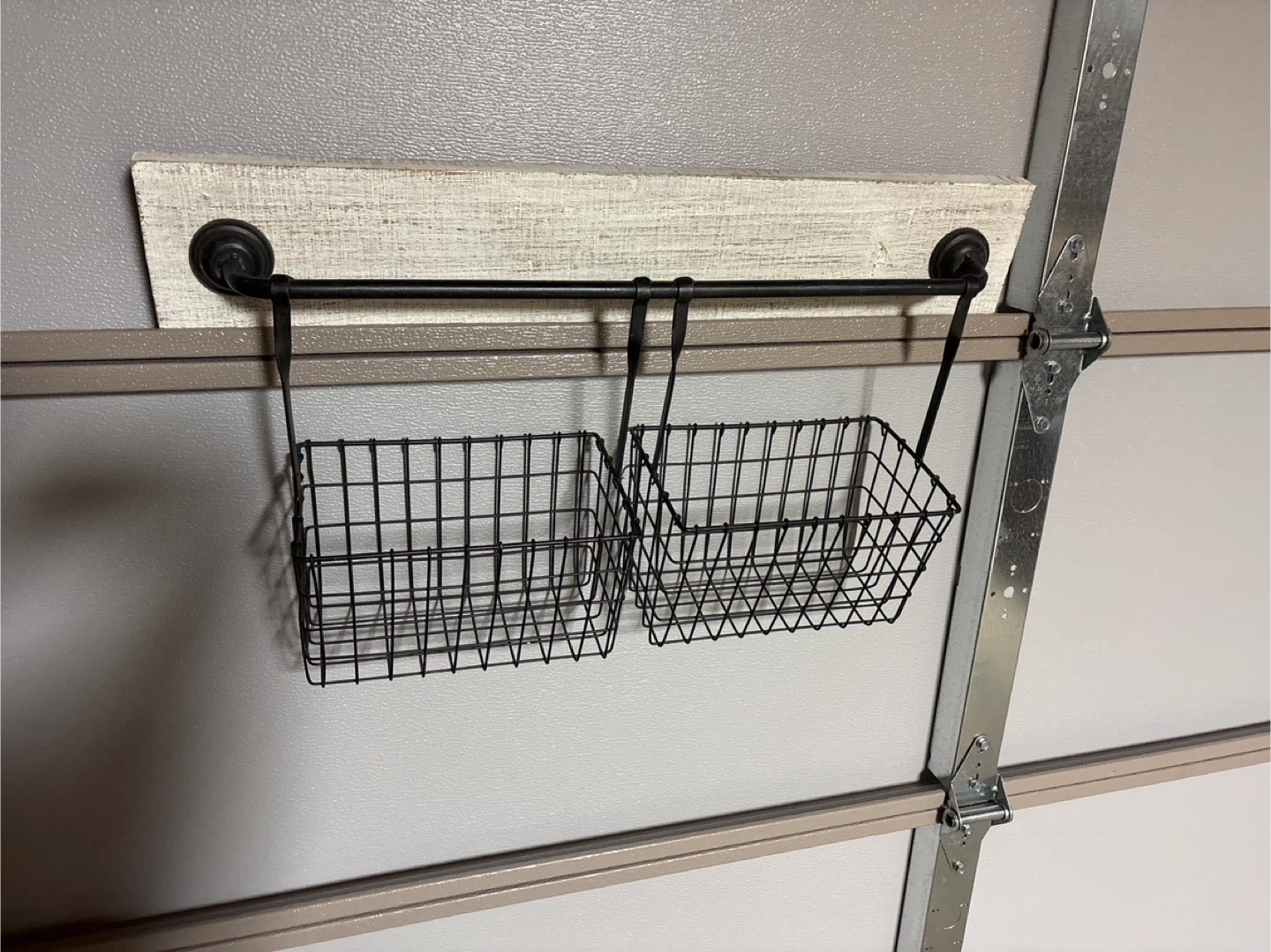 85These hanging wire baskets are a great way to add some storage and organization to your space! They feature a rustic wood plank and a black metal bar with two hanging wire baskets. Perfect for the kitchen, bathroom, or garage!