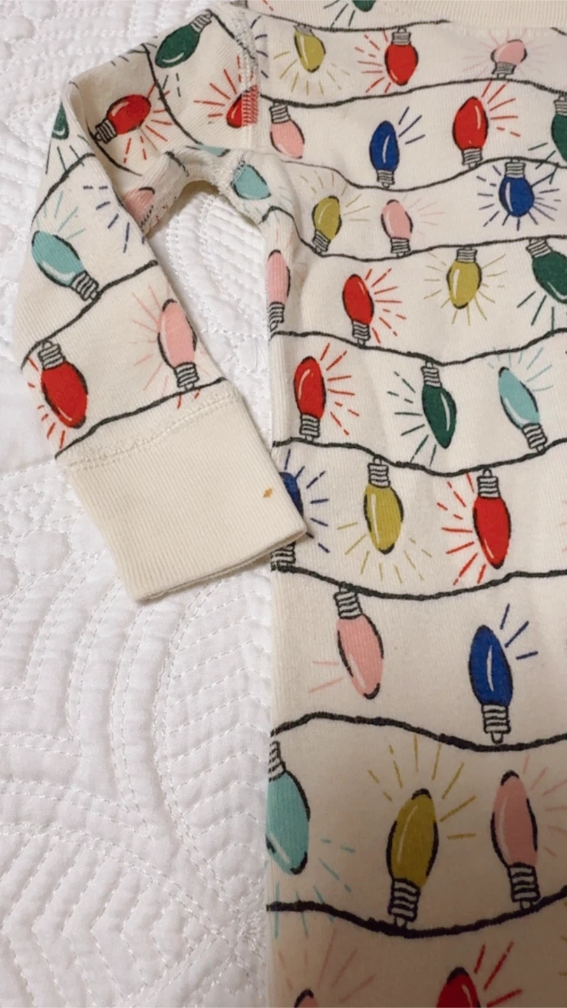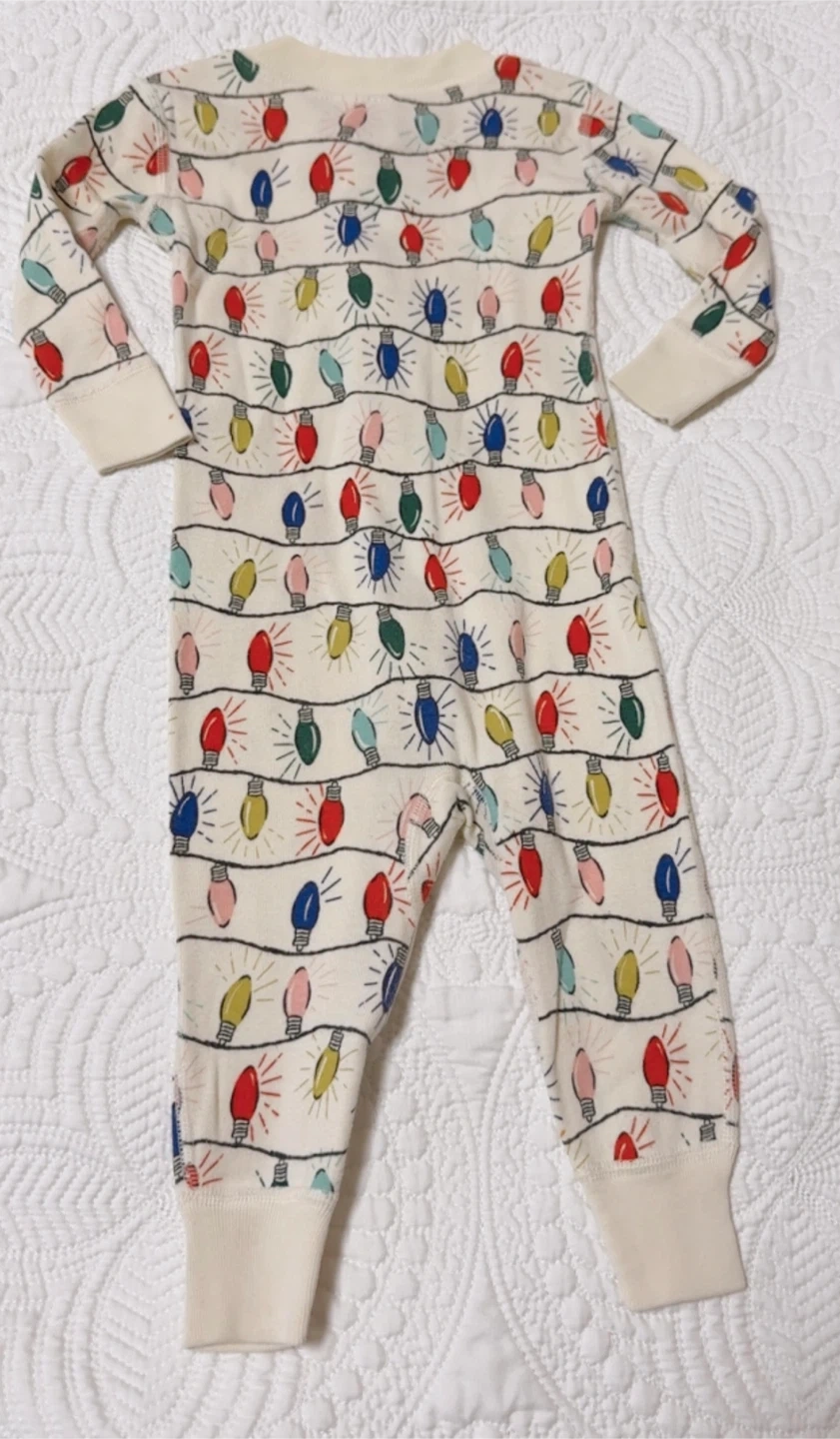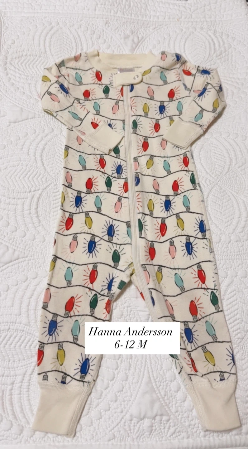 Cute Hanna Andersson baby sleeper featuring a fun holiday lights pattern! Size is 6-12 months. There is a small stain on the sleeve as pictured.
