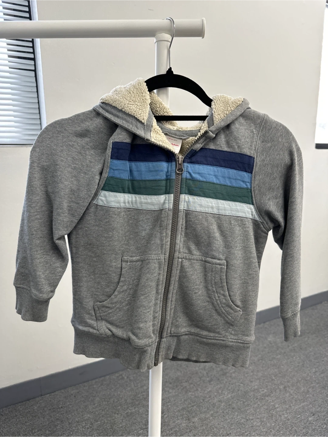 Here’s a gently used Hanna Andersson zip hoodie in size US 5! It features a sherpa-lined hood to keep your little one cozy. The hoodie is gray with blue and green stripes across the chest.