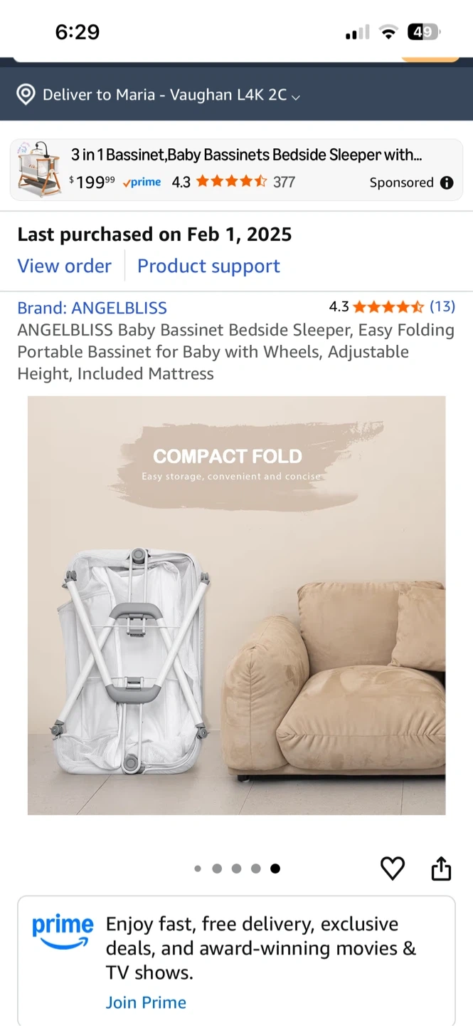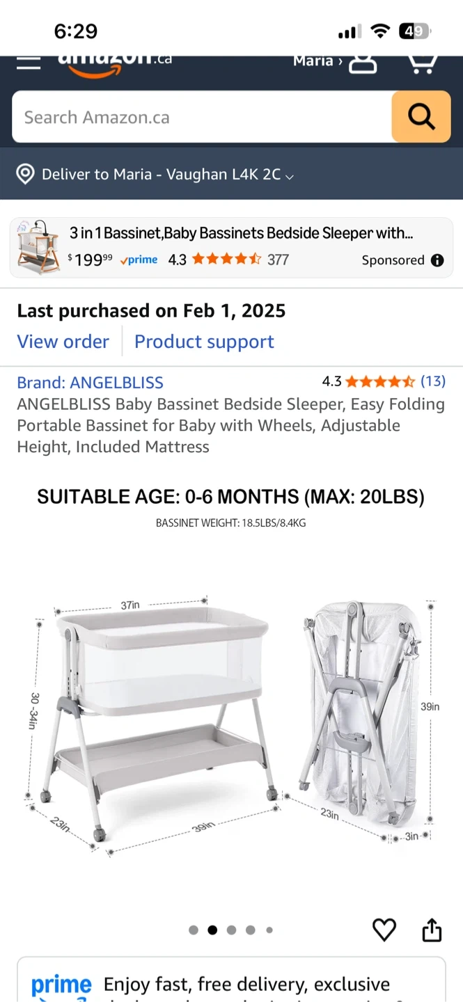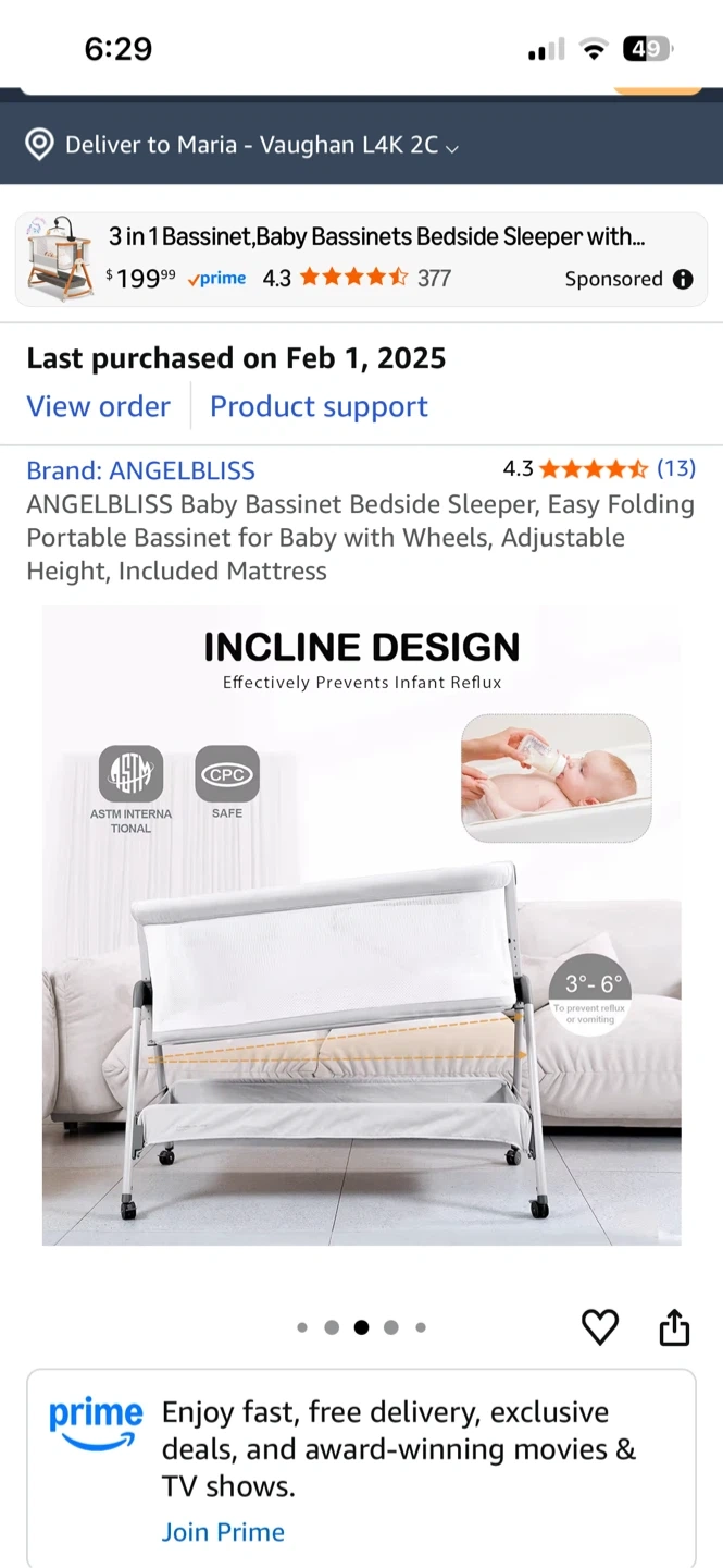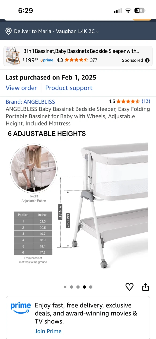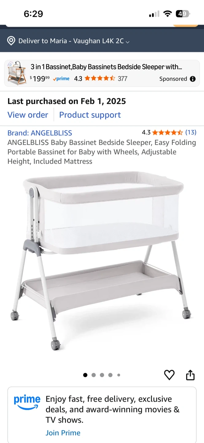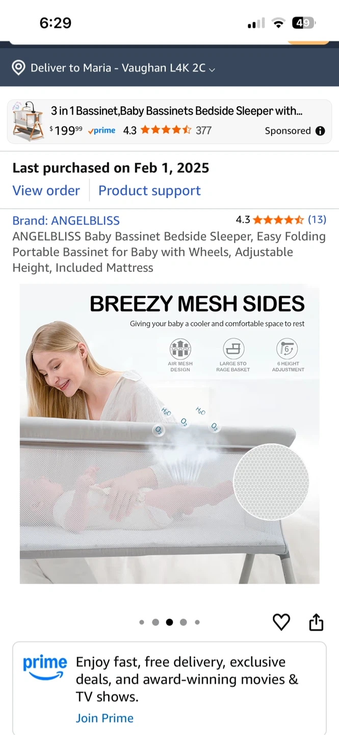 Selling an ANGELBLISS baby bassinet bedside sleeper. It's an easy folding portable bassinet with wheels and adjustable height, and includes a mattress. It features 6 adjustable heights and breezy mesh sides for a cooler and comfortable space for your baby. It also has an incline design to effectively prevent infant reflux. Last purchased on 2025 February 01