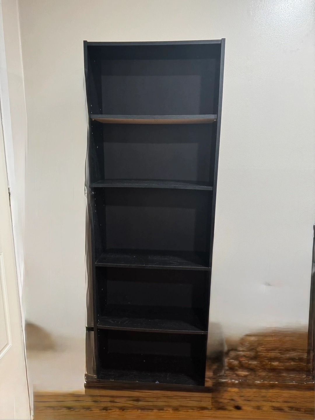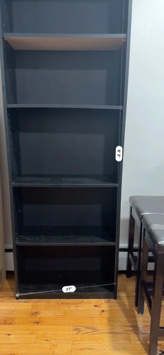 Black used bookshelf with 5 openings. 62 inches tall and 27 inches wide.