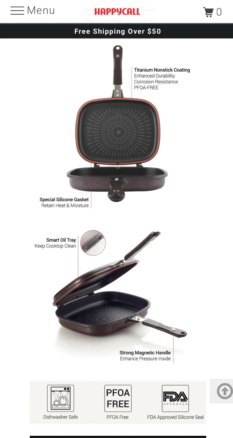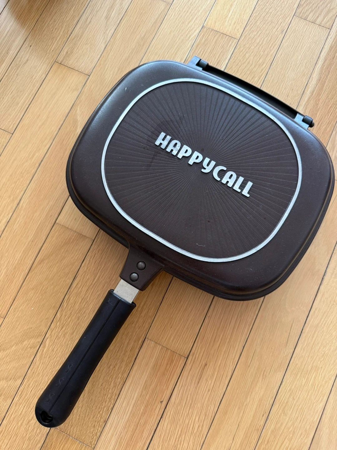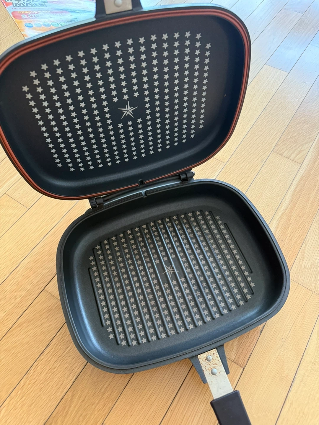 Selling a Happycall Titanium Double Pan Jumbo Grill. It features a titanium nonstick coating for enhanced durability and corrosion resistance. It also has a special silicone gasket to retain heat and moisture, and a smart oil tray to keep your cooktop clean. The strong magnetic handle enhances pressure inside. It's also PFOA-free and dishwasher safe! -It has been used lightly for grilling fish