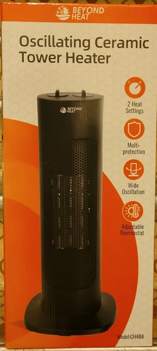 This is a Beyond Heat oscillating ceramic tower heater. It has 2 heat settings, multi-protection, and wide oscillation. It also features an adjustable thermostat for your convenience!