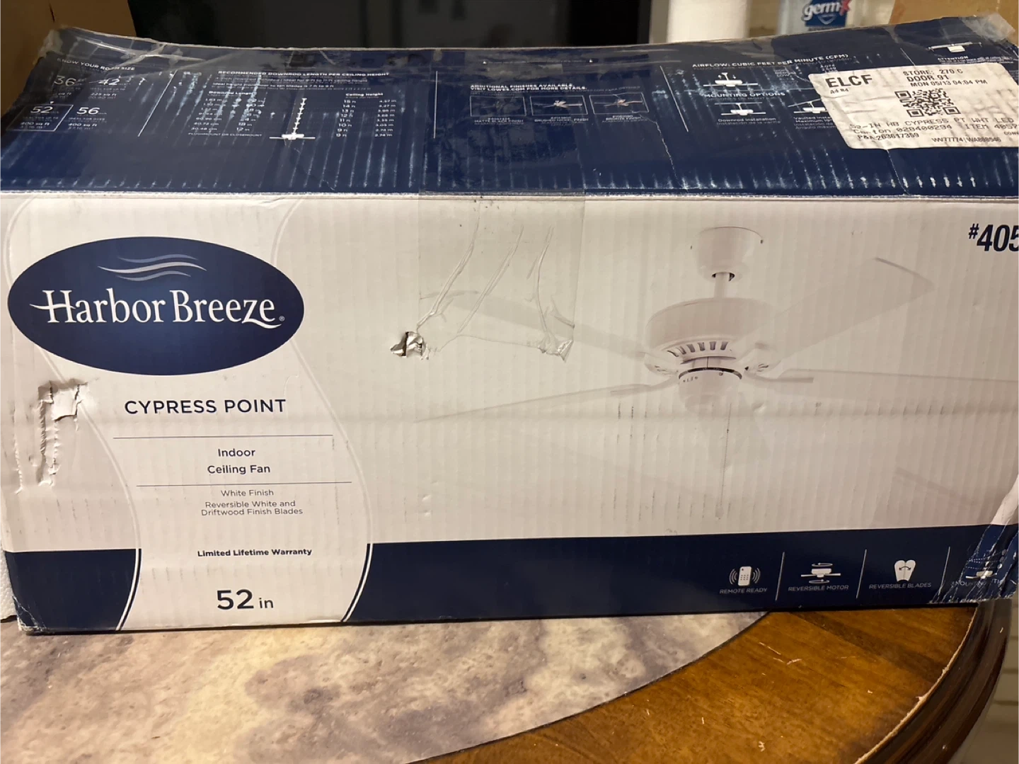 Selling a brand new Harbor Breeze Cypress Point 52-inch indoor ceiling fan! It features a white finish with reversible white and driftwood finish blades. Comes with all original components and is still in the box.
