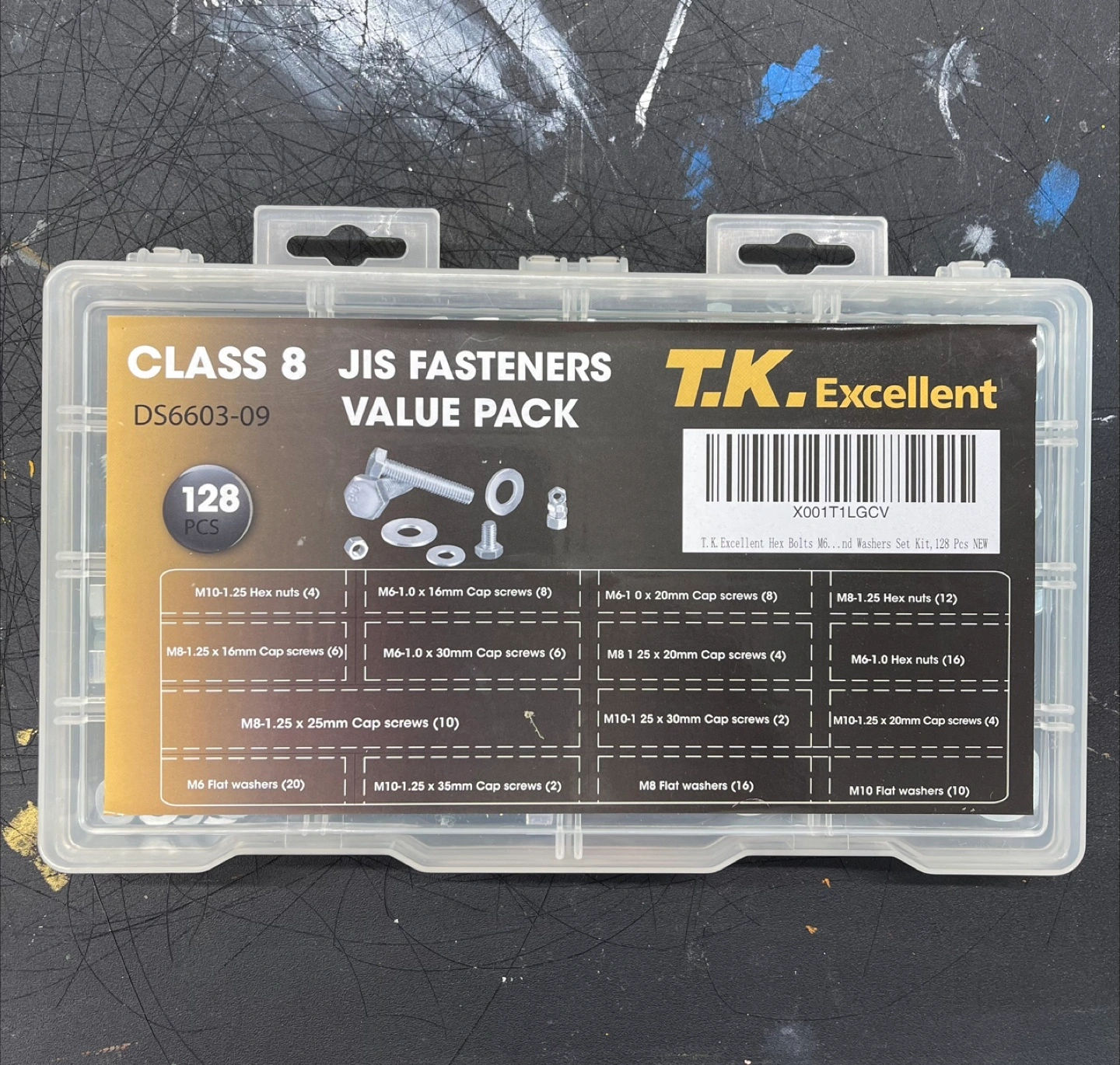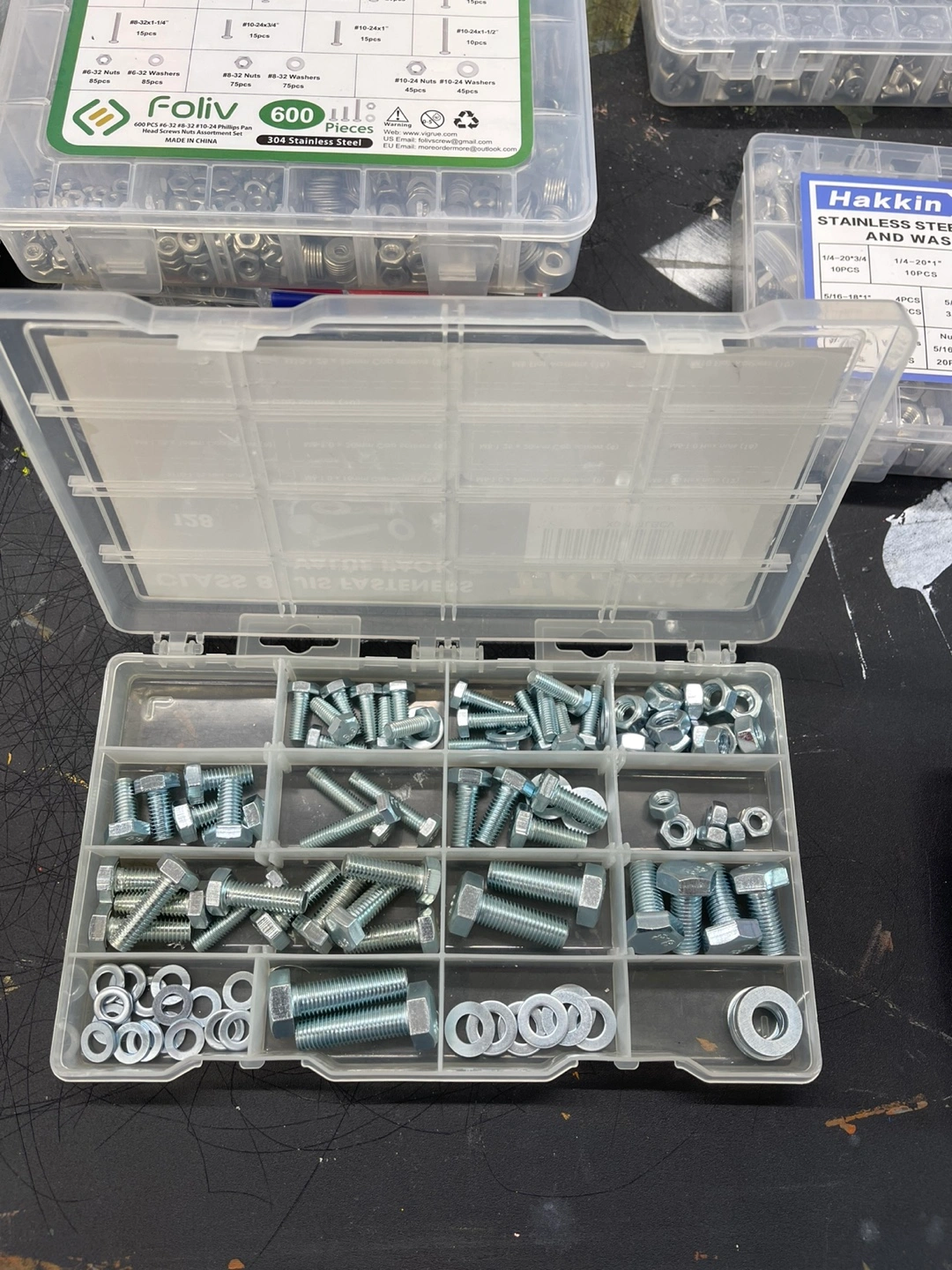 273A clear plastic organizer. Contains an assortment of fasteners. Organized into different compartments for easy access. Good for projects or repairs, so you can relax knowing you have the right hardware at hand.