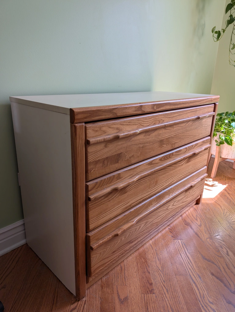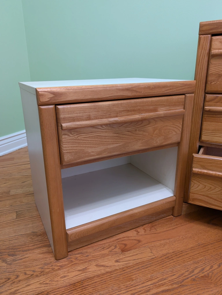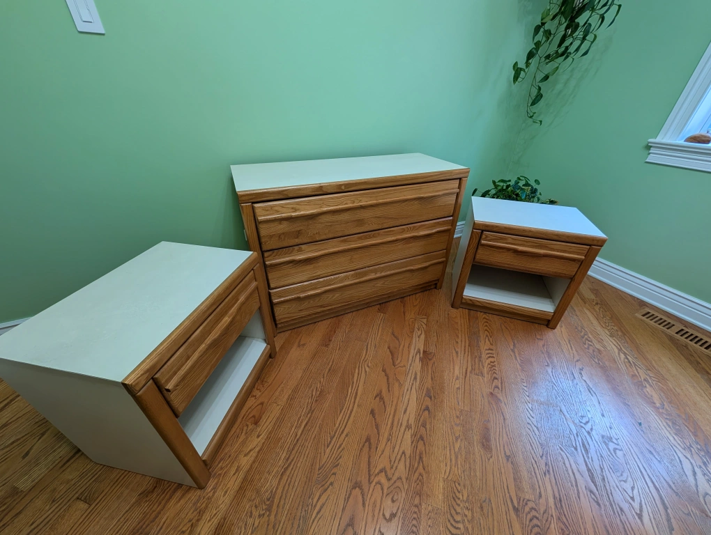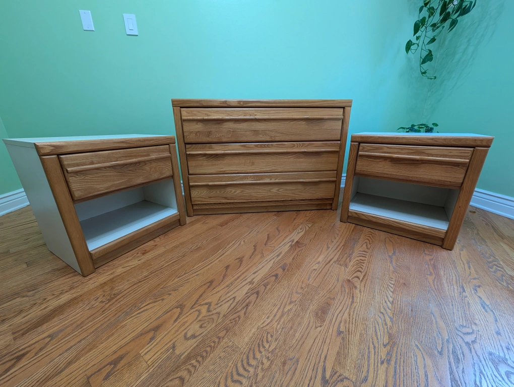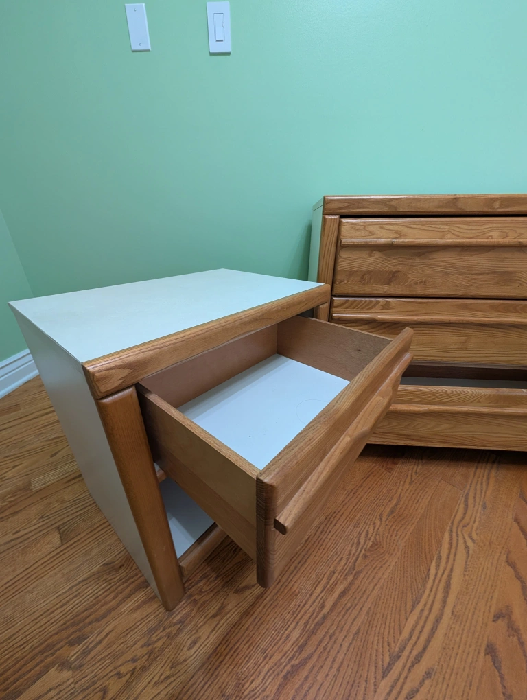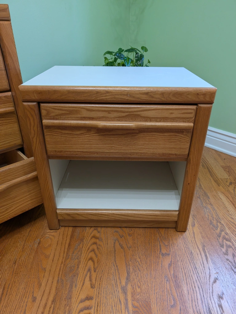 95Selling a wooden dresser and matching nightstand. They are in good condition and would be great for a bedroom set. The dresser has multiple drawers for storage, and the nightstand has a drawer and open shelf. the night stands are 22x 22x 16in the dresser is 44 x 30 x 18in