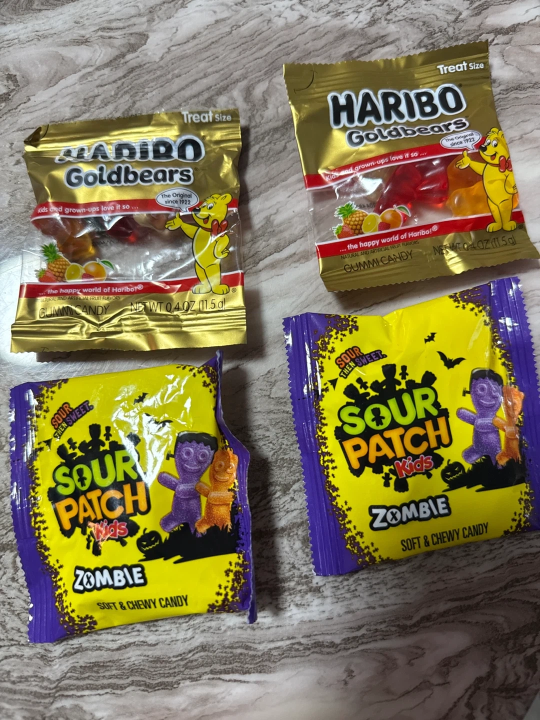 Selling a mix of Haribo Goldbears and Sour Patch Kids Zombie candy! Each bag is a treat size. Perfect for a quick snack or Halloween goodies