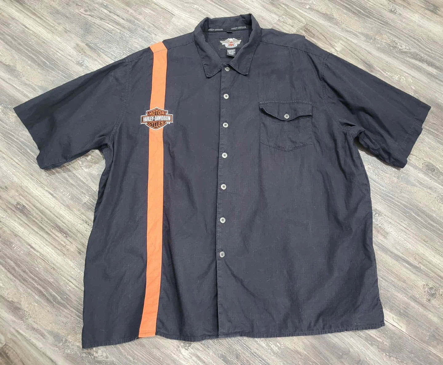 81Harley-Davidson button-up shirt in size 3XL! It's black with an orange stripe and the classic Harley logo. Made of 100% cotton.