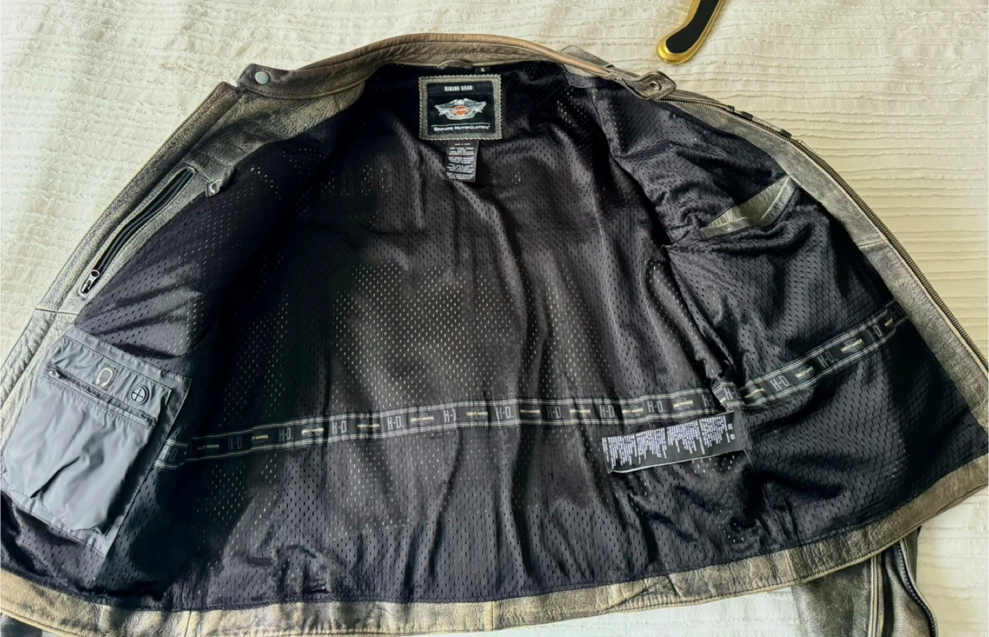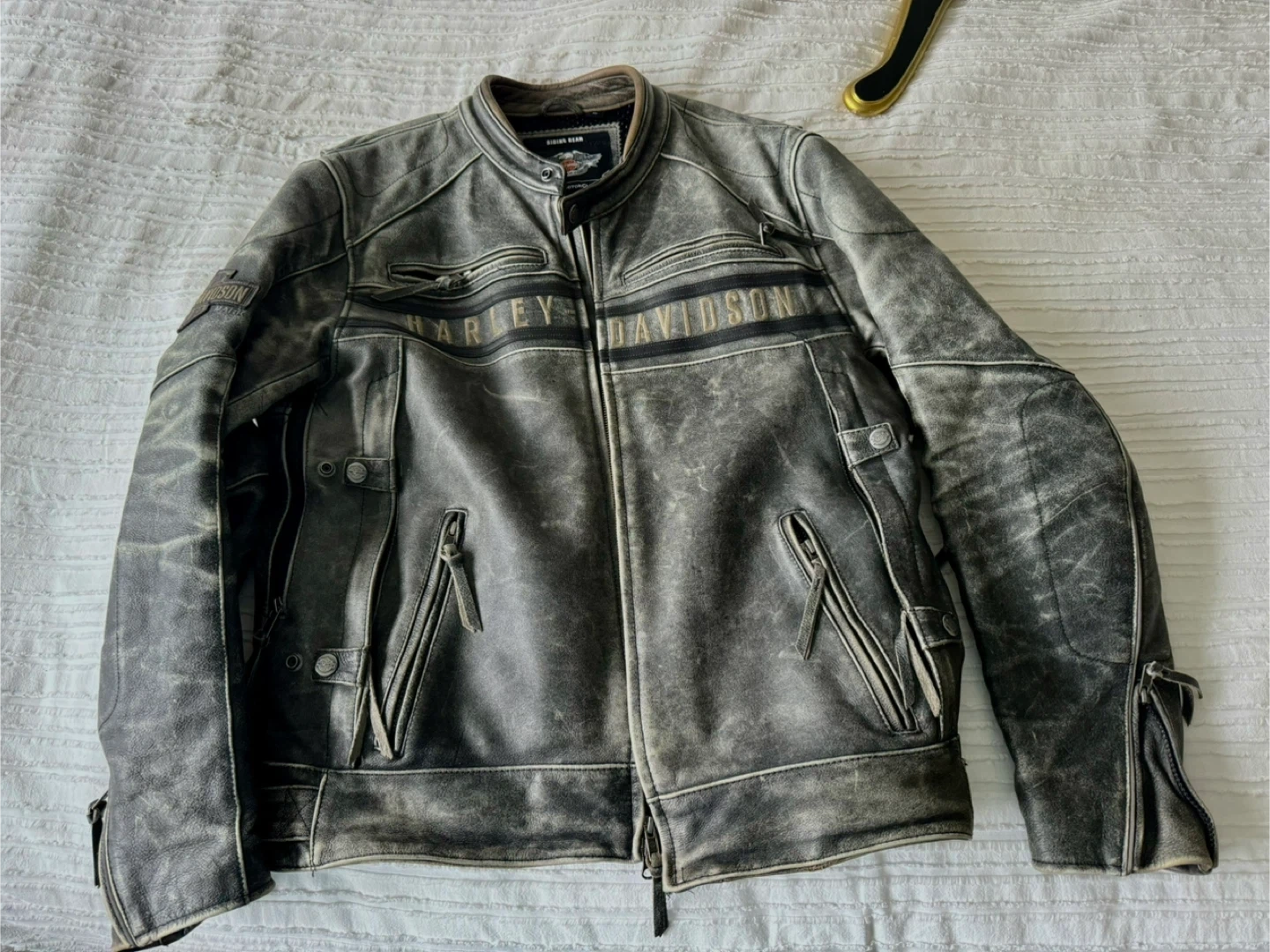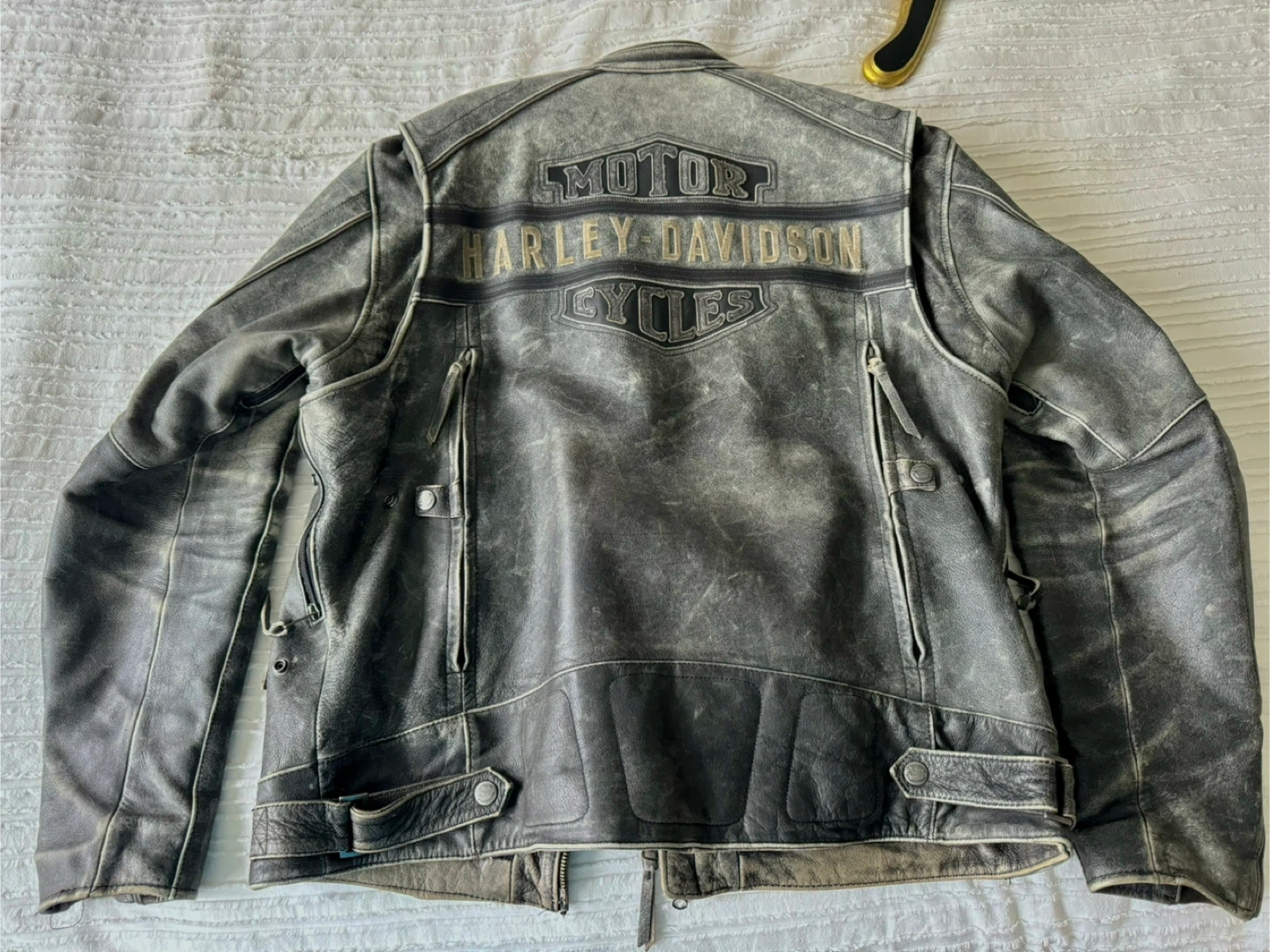 Harley-Davidson leather jacket in a worn, vintage style. It has the Harley-Davidson logo on the front and back. The jacket has multiple pockets and a zipper closure. It's a stylish and durable jacket for any Harley enthusiast