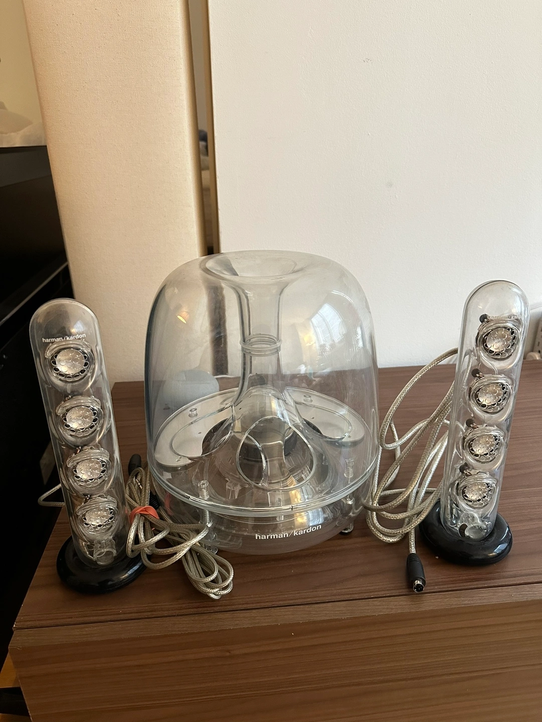 Harman Kardon Soundsticks III in great condition. Comes in original box for easy storage. Also giving bluetooth receiver (https://a.co/d/8DJhpqM)