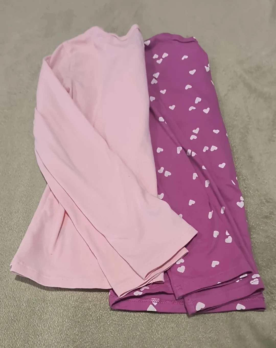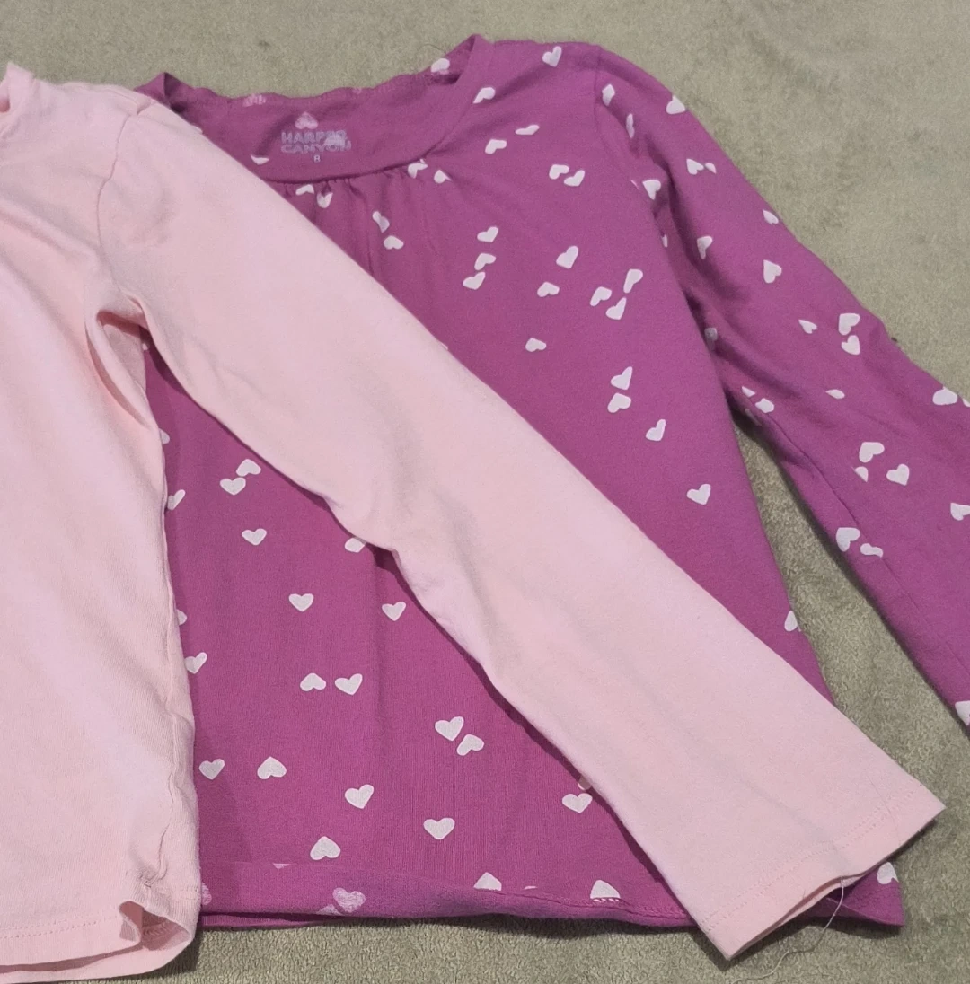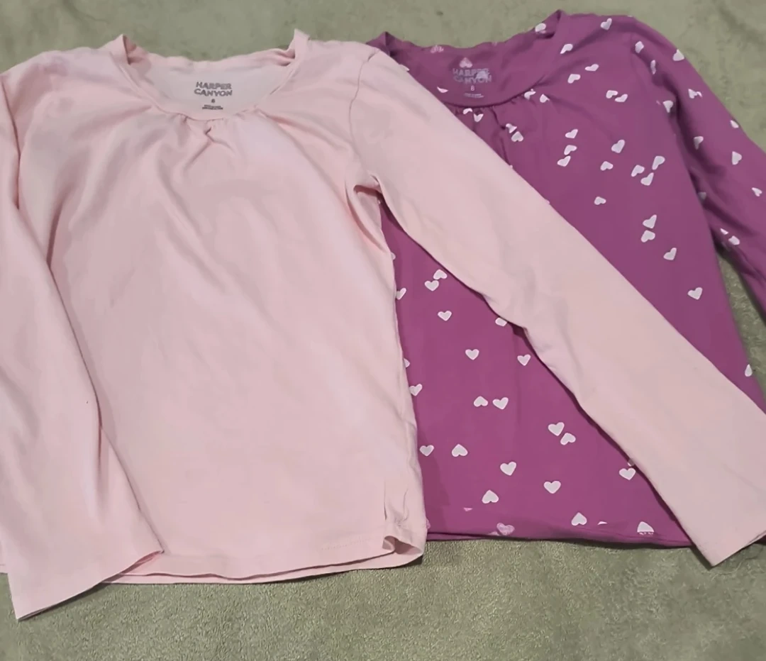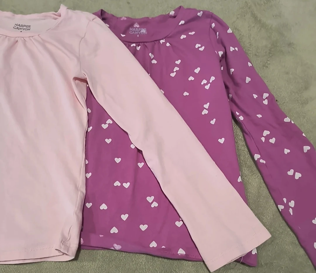 65Two adorable long-sleeve shirts from Harper Canyon for girls! One is a solid light pink, and the other is a vibrant purple with a cute white heart pattern. Both are size 8 and in great condition, ready for a new home!
