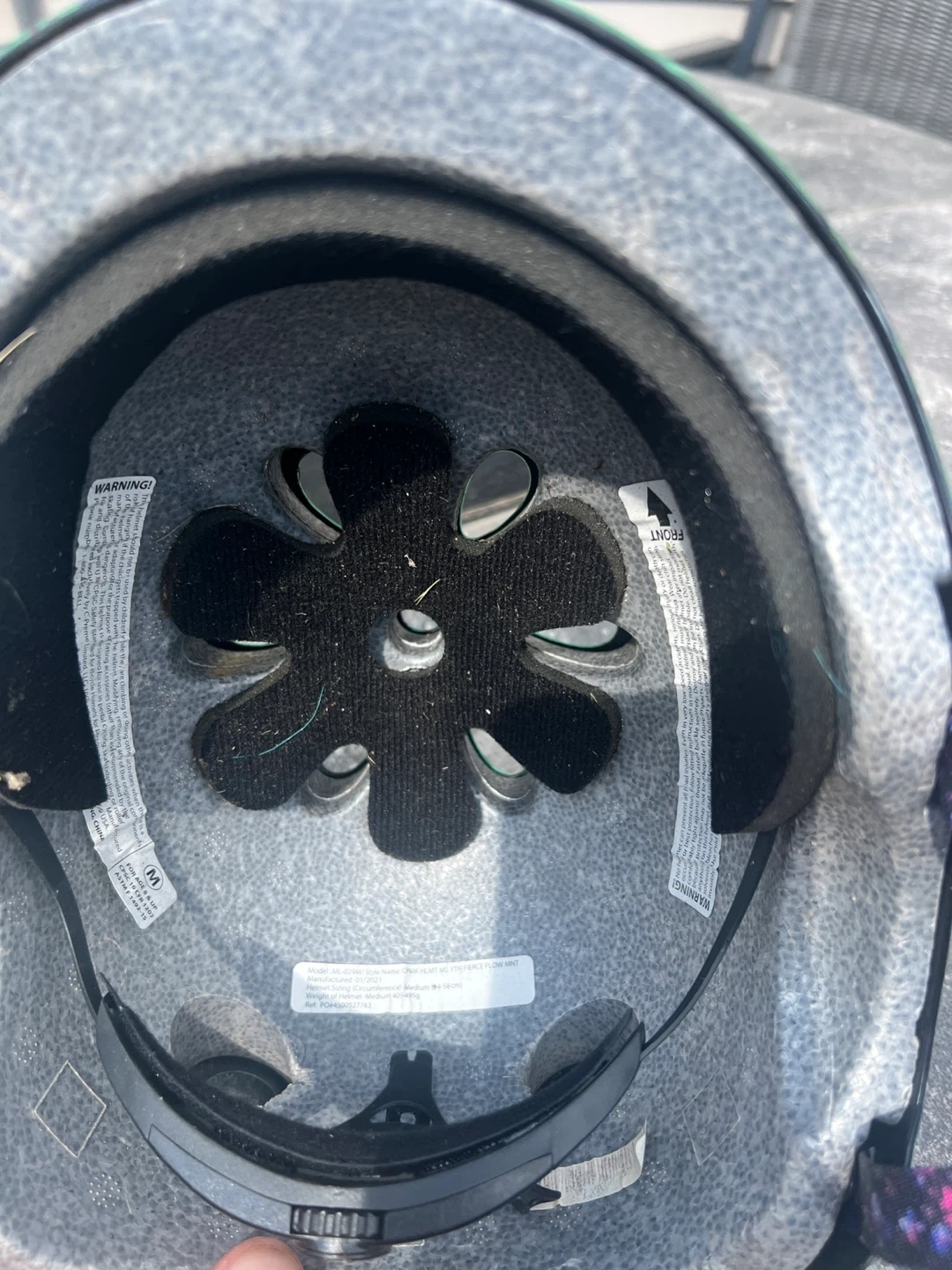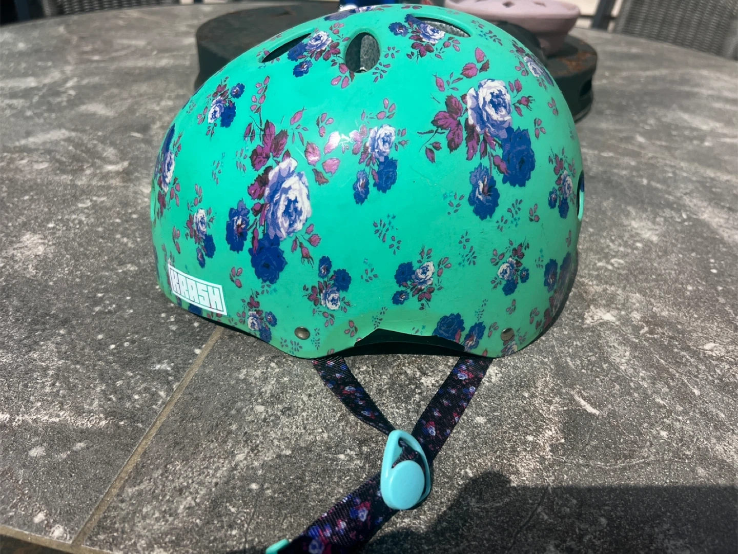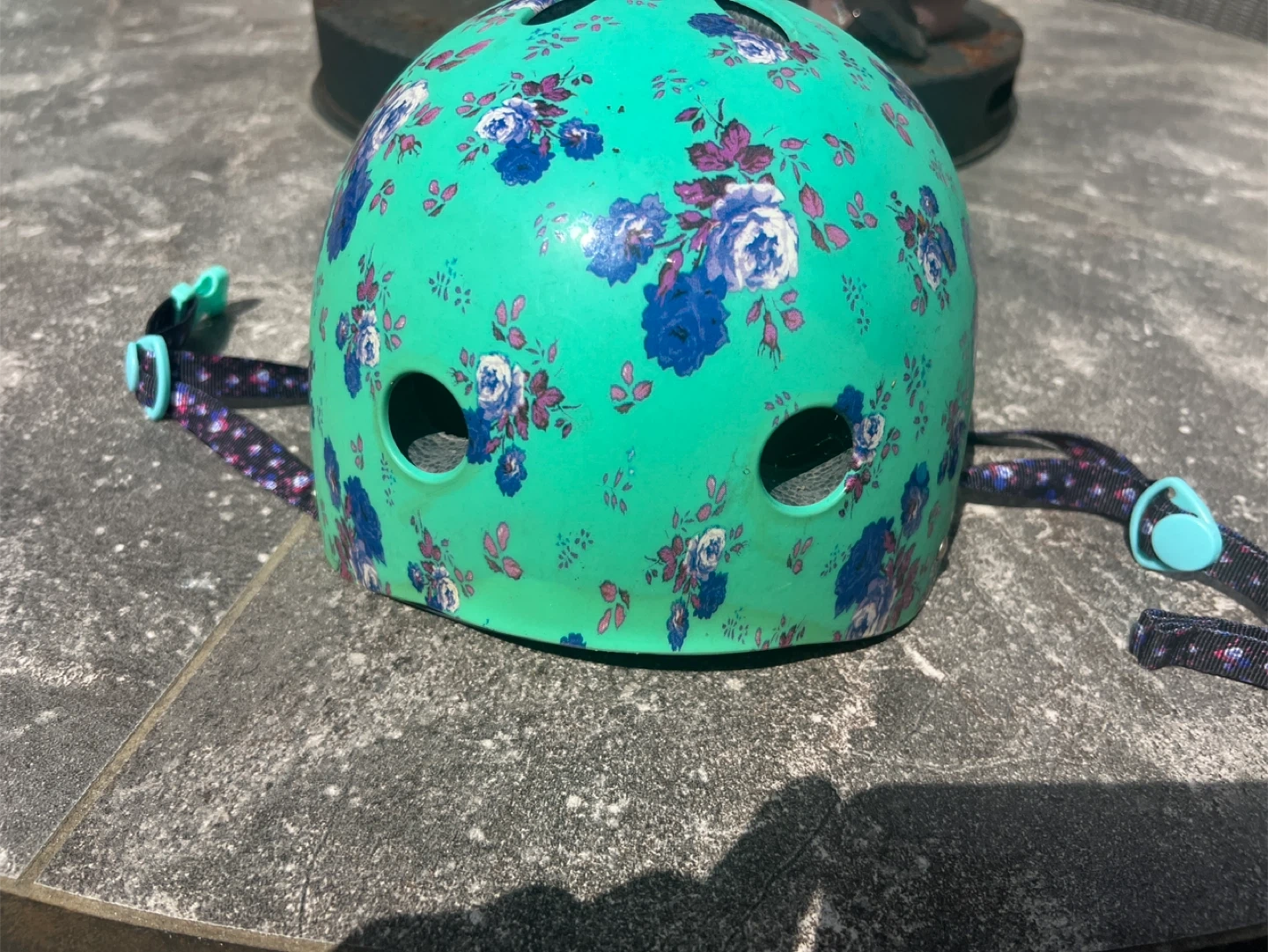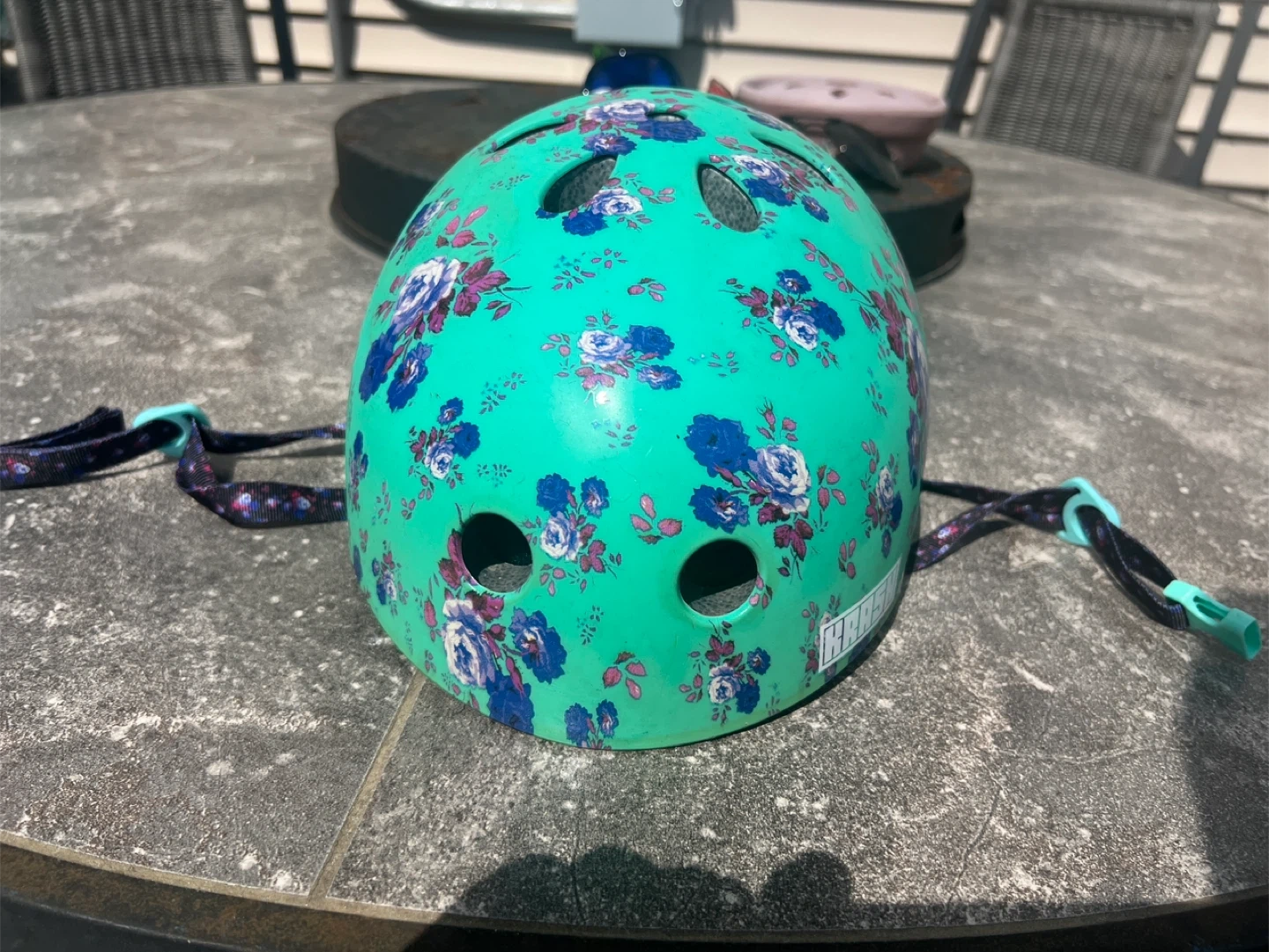 Harper helmet in a teal color with a floral design. It's in good condition and ready for a new owner cleaned and disinfected. Size medium for teens