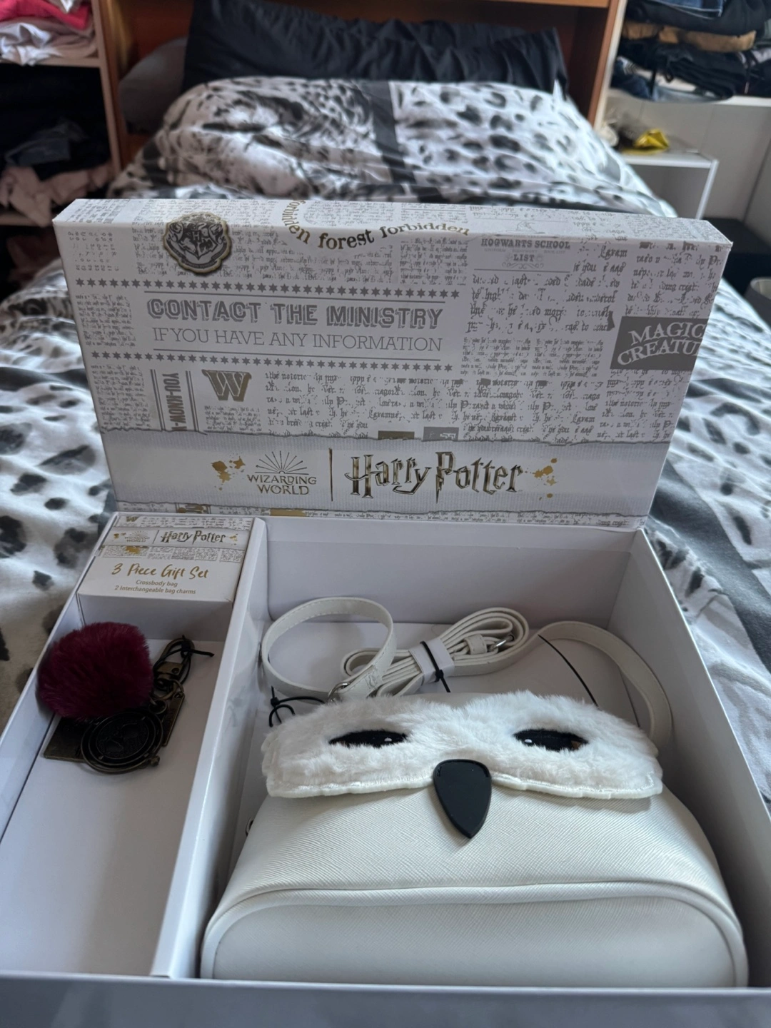 49Adorable Hedwig crossbody bag. Includes two charms and a burgundy pom-pom keychain. New, in box. Wizarding World officially licensed.