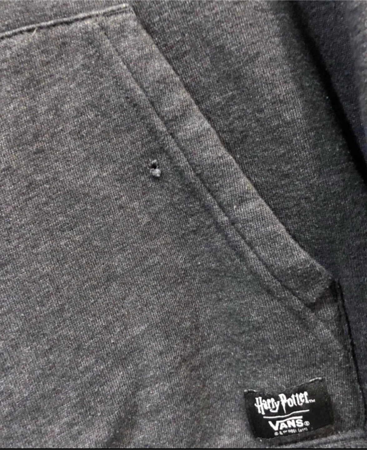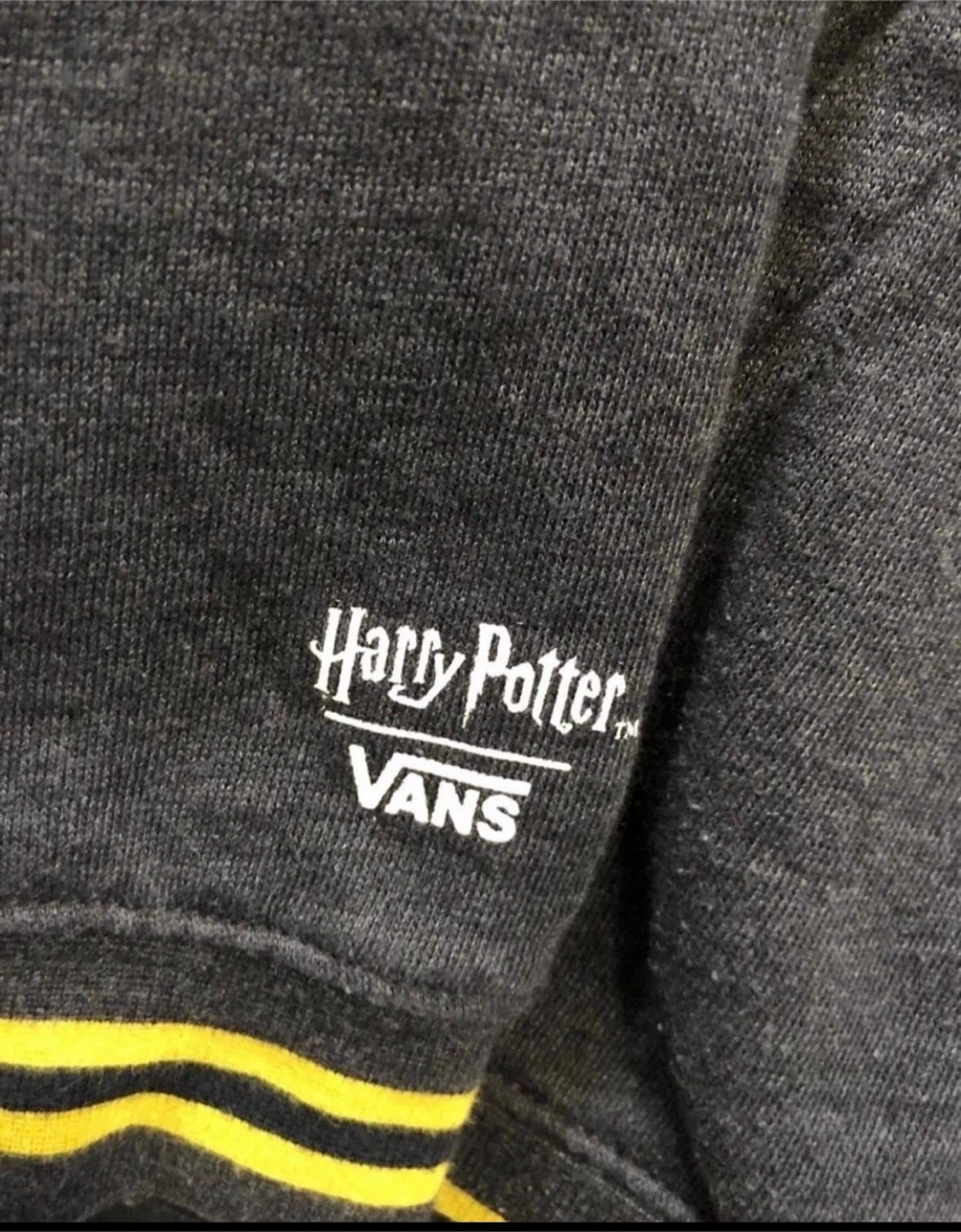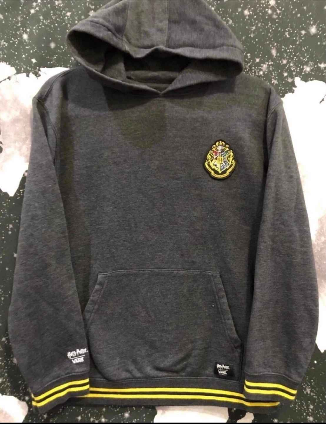 Vans x Harry Potter Hoodie , color is gray with front Hogwarts Crest patch representing Gryffindor Slitherin Hufflepuff & Ravenclaw houses. Preowned condition *discoloration near sleeve, small hole near front pocket* Sz. XL Youth *Similar to Men’s Medium* Measurements (22”x25” / Sleeve 21”)