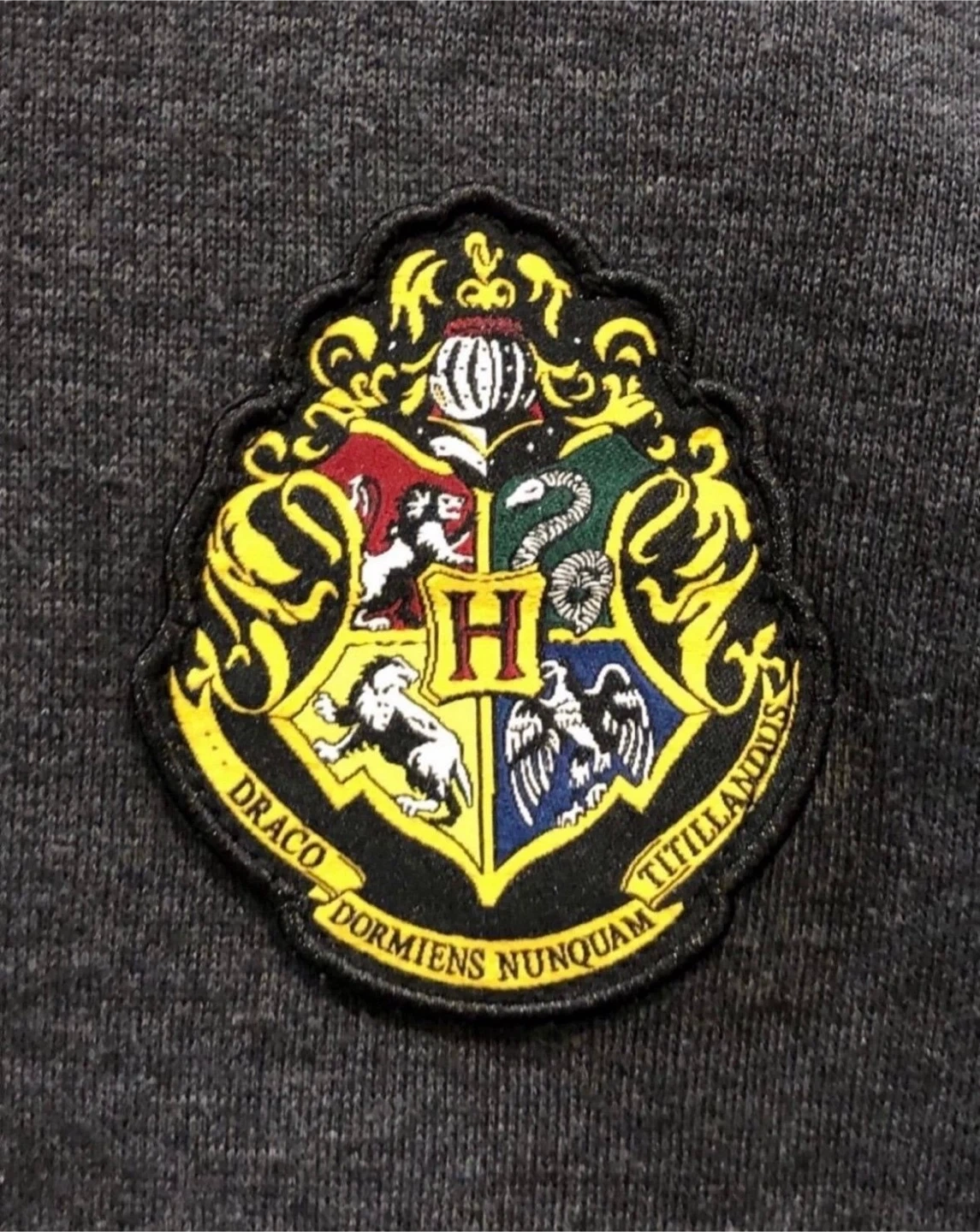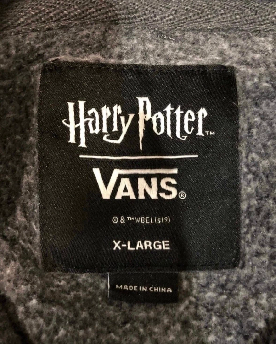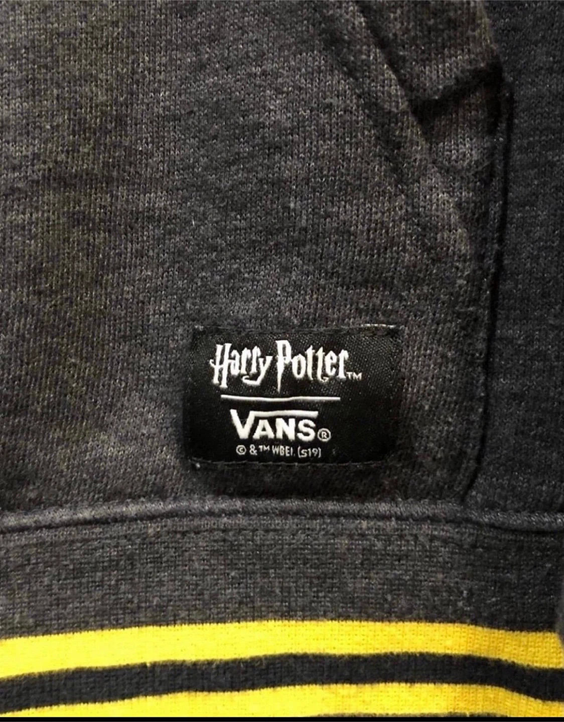 Vans x Harry Potter Hoodie , color is gray with front Hogwarts Crest patch representing Gryffindor Slitherin Hufflepuff & Ravenclaw houses. Preowned condition *discoloration near sleeve, small hole near front pocket* Sz. XL Youth *Similar to Men’s Medium* Measurements (22”x25” / Sleeve 21”)