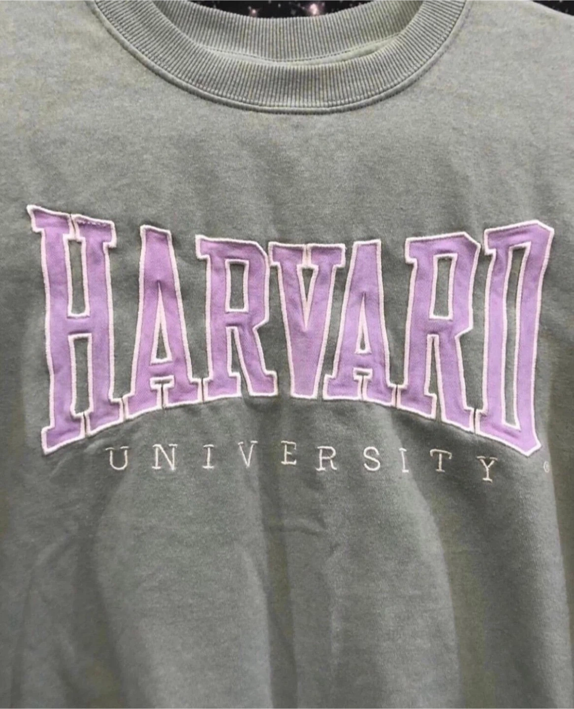 Harvard University collegiate academic scholar campus spell out style crop sweatshirt, color is green with front embroidered school lettering. Preowned condition Sz. Small Measurements (21”x22”)