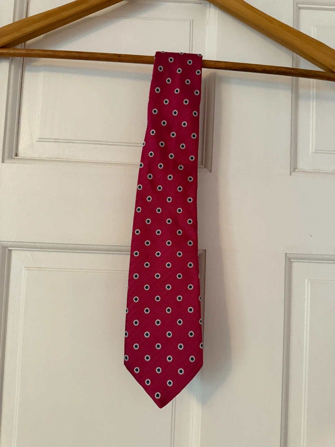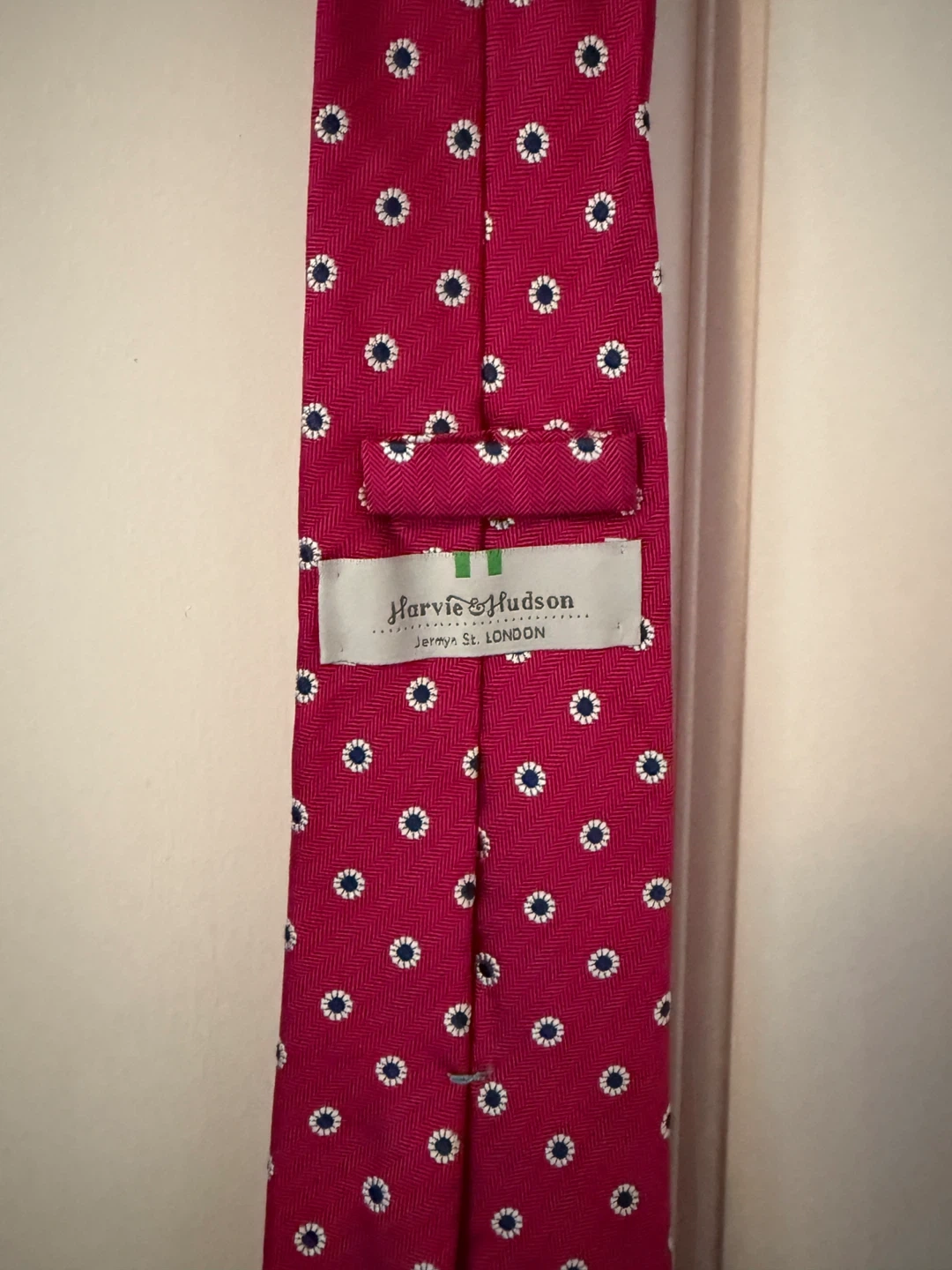 Selling a Harvie & Hudson silk tie in a vibrant pink color with a floral pattern. It's in great condition and ready to add a touch of style to your wardrobe. The tie is made of high-quality silk, giving it a luxurious feel and a sophisticated look