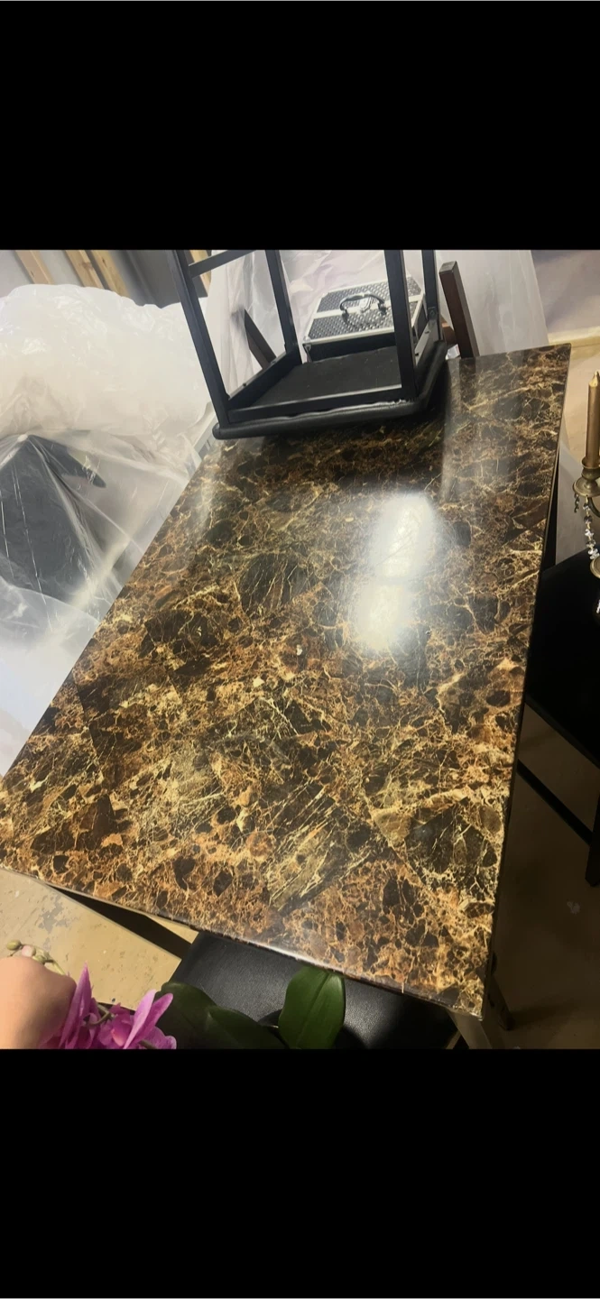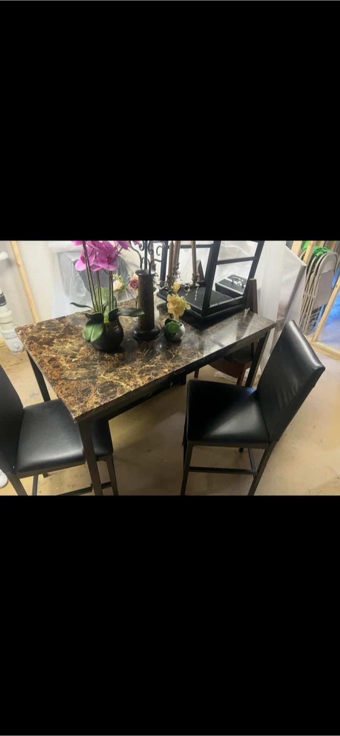 Selling a dining table with a faux marble top and two matching chairs. The table has a beautiful marble pattern and is in good condition. Perfect for a small dining area or kitchen!