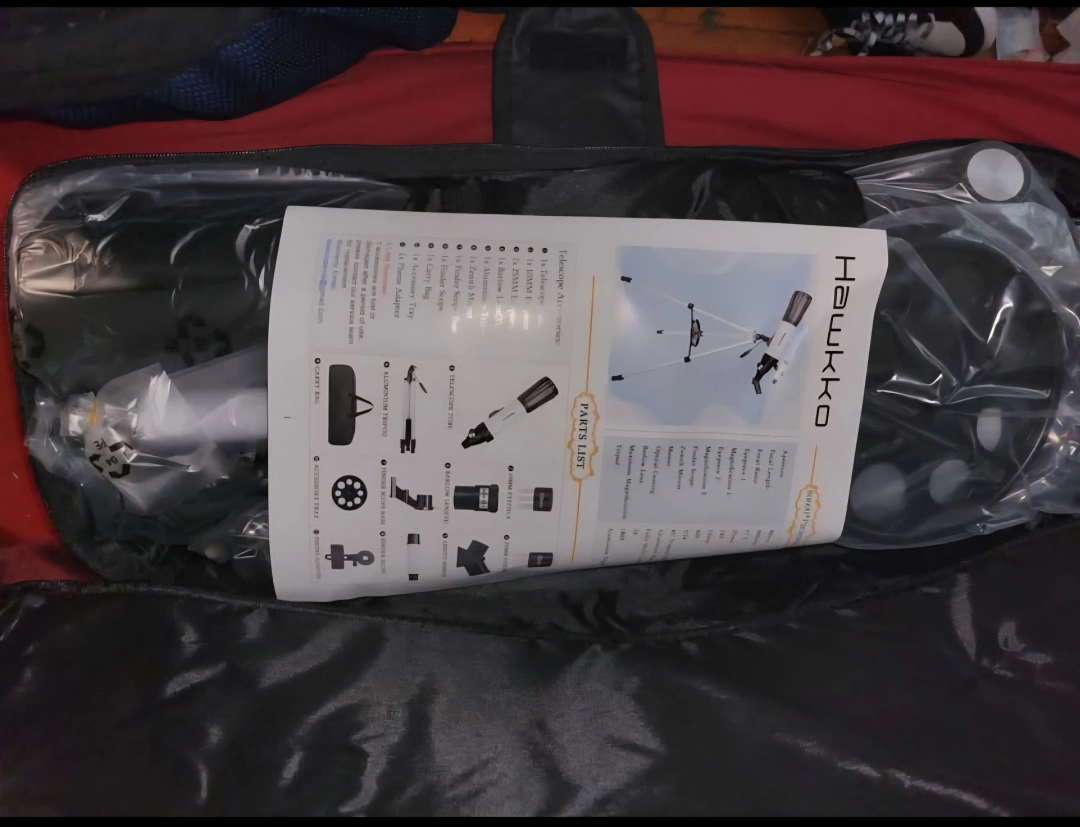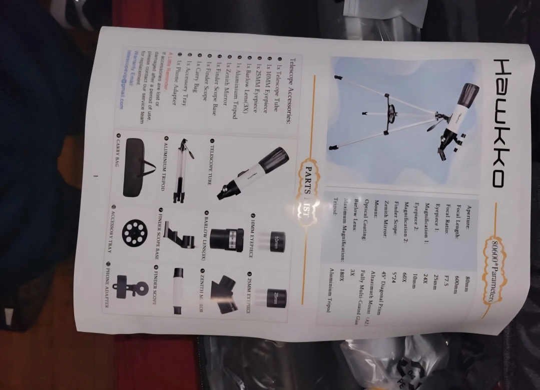 Selling a HAWKKo telescope kit. It comes with all the accessories, including: - Telescope Tube - 10MM Eyepiece - 25MM Eyepiece - 3X Barlow Lens(BK7) - Zenith Mirror - Finder Scope - Finder Scope Base - Accessory Tray - Carry Bag - Phone Adapter - Aluminum Tripod