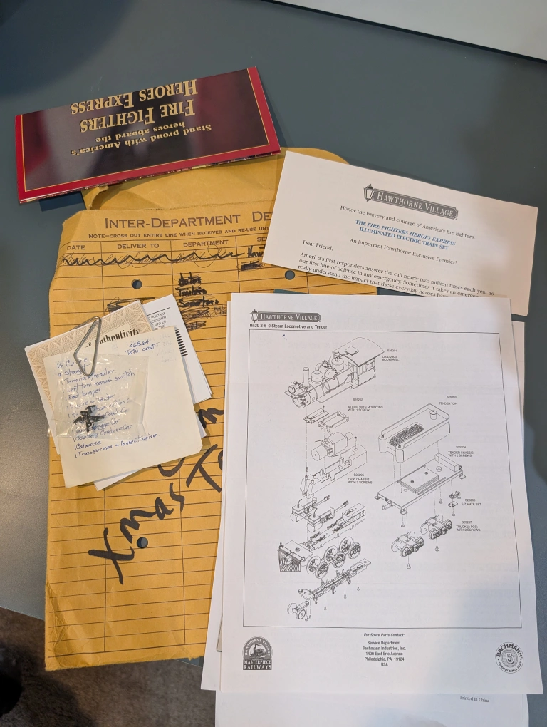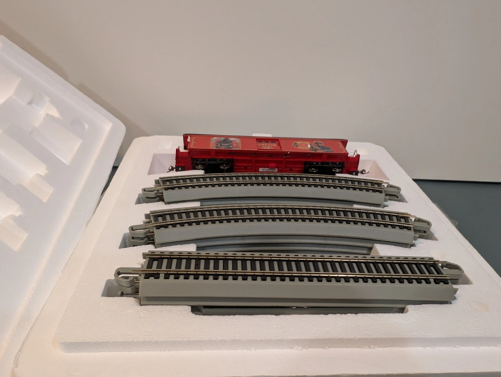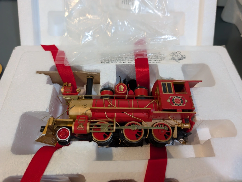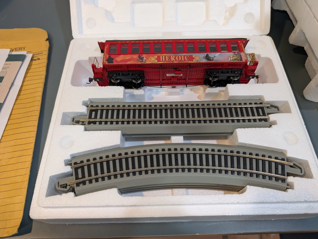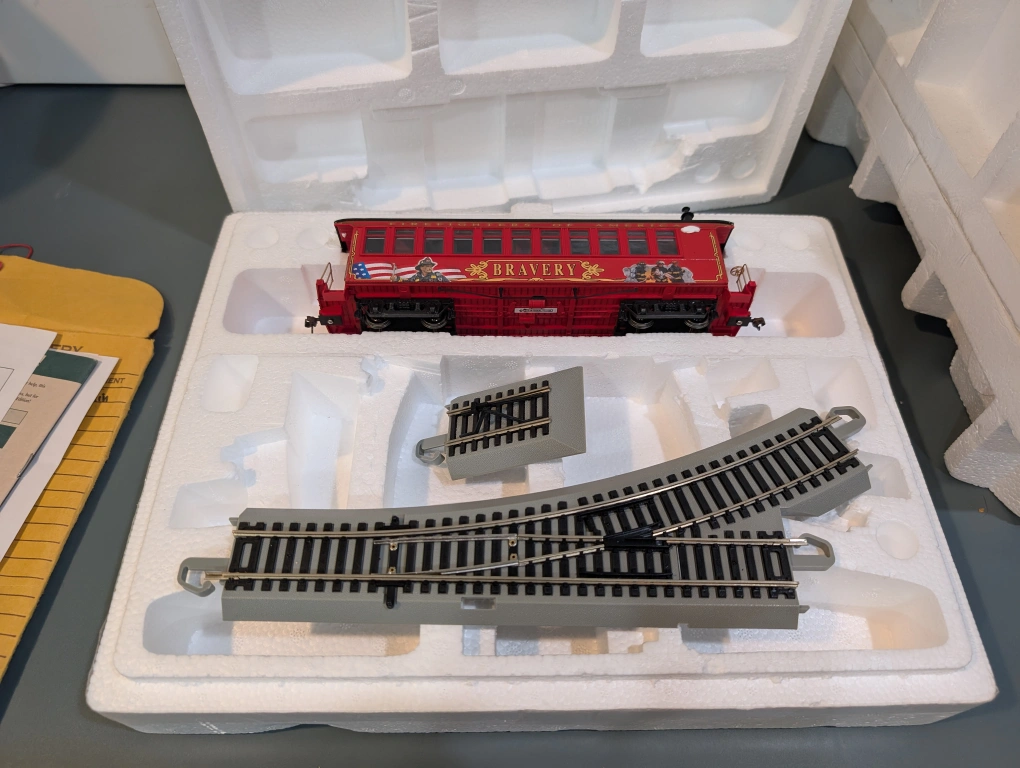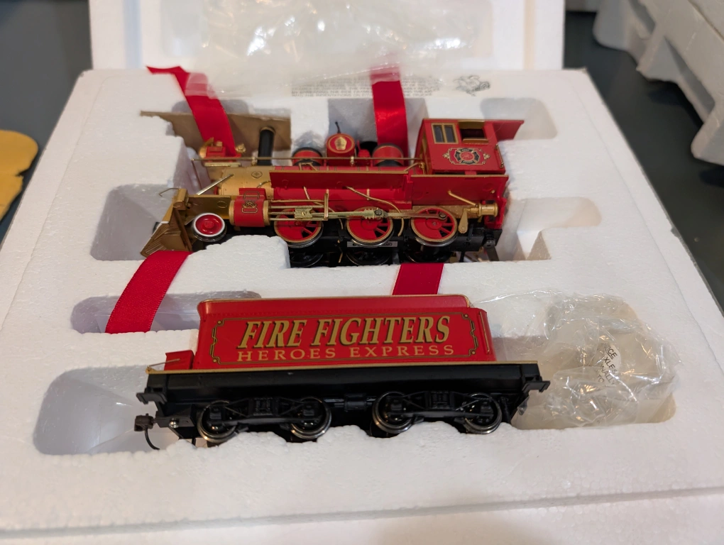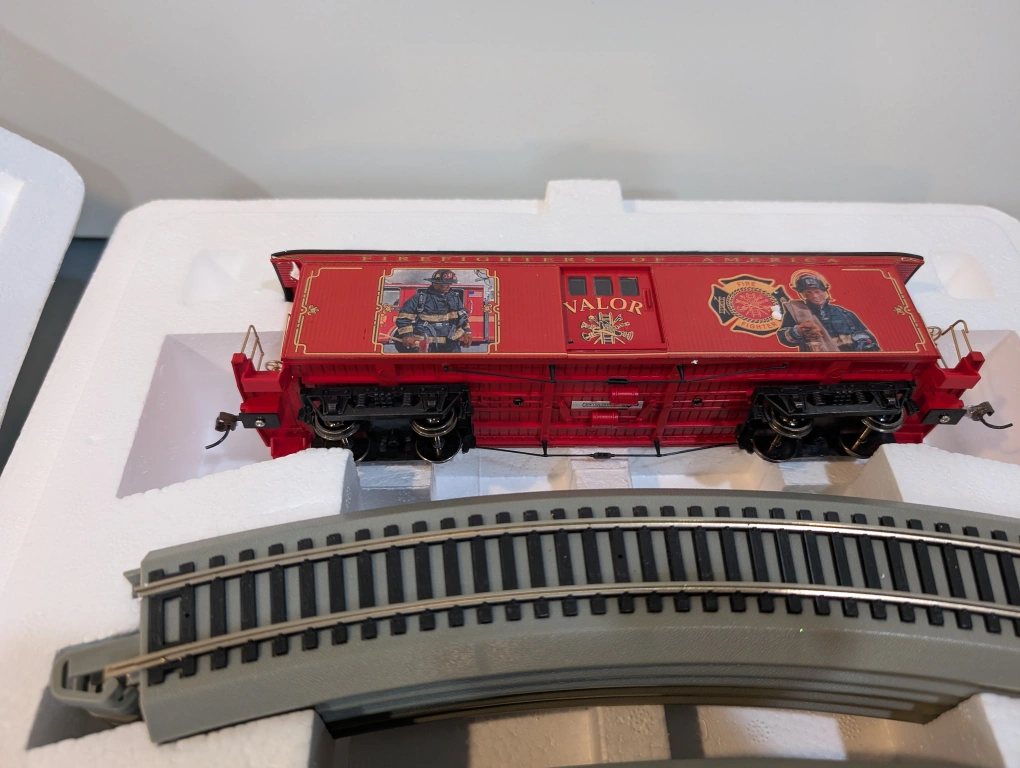 15Hawthorne Village Fire Fighters Heroes Express Illuminated Train Set. Includes: -Locomotive and Tender -Heroic Car -Track pieces -Transformer and power wire